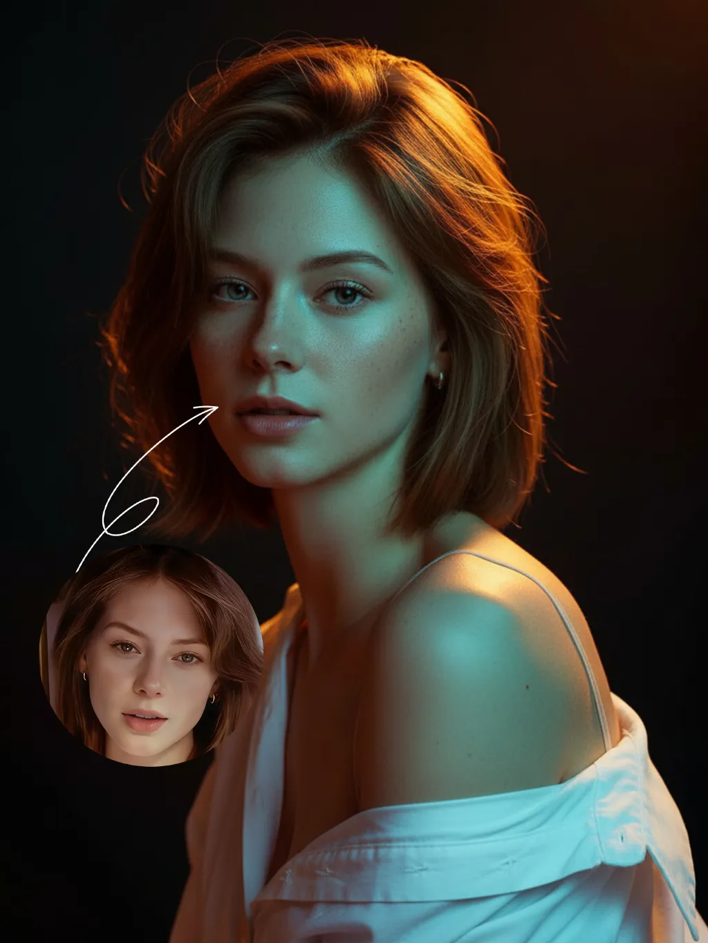 The uploaded portrait serves as the strict identity anchor, with its original facial contours, hairstyle silhouette, fair skin texture, and youthful demeanor replicated with pinpoint accuracy. It is transformed to exude a strong Eurasian Western style, with the hair color replaced by long, wavy light golden hair that maintains a slightly messy and voluminous look. This is a black-and-white artistic portrait of a young woman wearing a loose white shirt, with one shoulder naturally slipping off the garment. Her light golden long hair gently frames her delicate face, with strands illuminated by sunlight to showcase an exquisite luster, while her skin appears delicate and smooth. Sitting upright and facing the camera, she has a calm and pensive gaze, along with a relaxed expression that carries a narrative quality. Shot in a professional studio against a pure gray minimalist background, the image employs soft cinematic side-backlighting to create a three-dimensional silhouette, complemented by a precise ray of hair light that renders each strand of the golden hair distinct and layered with transparency. The shadow areas retain their depth, and the highlight transitions smoothly, fostering an elegant and serene atmosphere. Boasting an 8K hyper-realistic resolution and a high-contrast black-and-white aesthetic, the portrait features extremely sharp details where even pores and individual hair strands are visible, with natural and authentic skin texture. The minimalist composition is free of redundant elements, and the overall style is elegant and sophisticated, combining a sense of refinement with narrative depth to meet the standards of commercial professional photography.