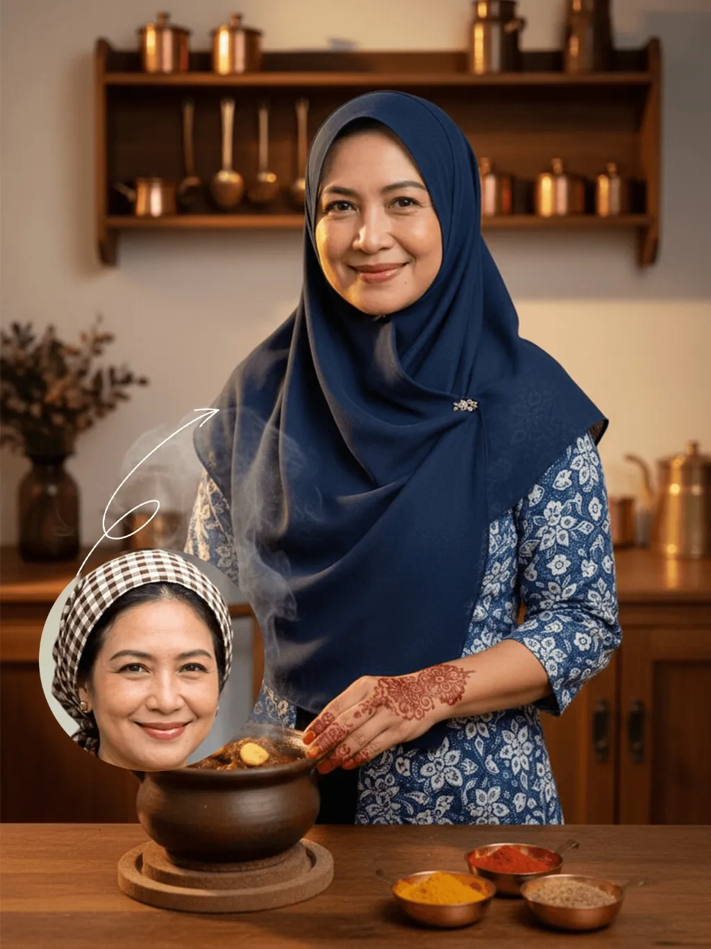 Strictly lock the identity of the uploaded portrait (preserve facial contours, native Indian skin tone, hairstyle, and age). Aspect ratio 3:4, photorealistic style, high-definition and detailed: The subject is a smiling Indonesian woman positioned centrally in the frame, wearing a dark blue hijab and a blue-and-white patterned traditional outfit, preparing Eid al-Fitr feast in a cozy, rustic Indonesian kitchen. Her hands, adorned with intricate reddish-brown Henna patterns, gently rest on a small, partially visible steaming pot of Rendang (spiced beef stew) with a tiny portion of ginger chunks, ensuring food occupies only a very small portion of the frame. The background features wooden cabinets and vintage copper utensils, with a minimal arrangement of small brass cookware and tiny copper bowls holding vibrant spices like turmeric powder, red chili powder, and cumin. Warm, golden lighting creates a festive and inviting Eid atmosphere, highlighting the colorful contrast between the Henna art and the rich, subtle spices, while keeping the focus firmly on the central figure