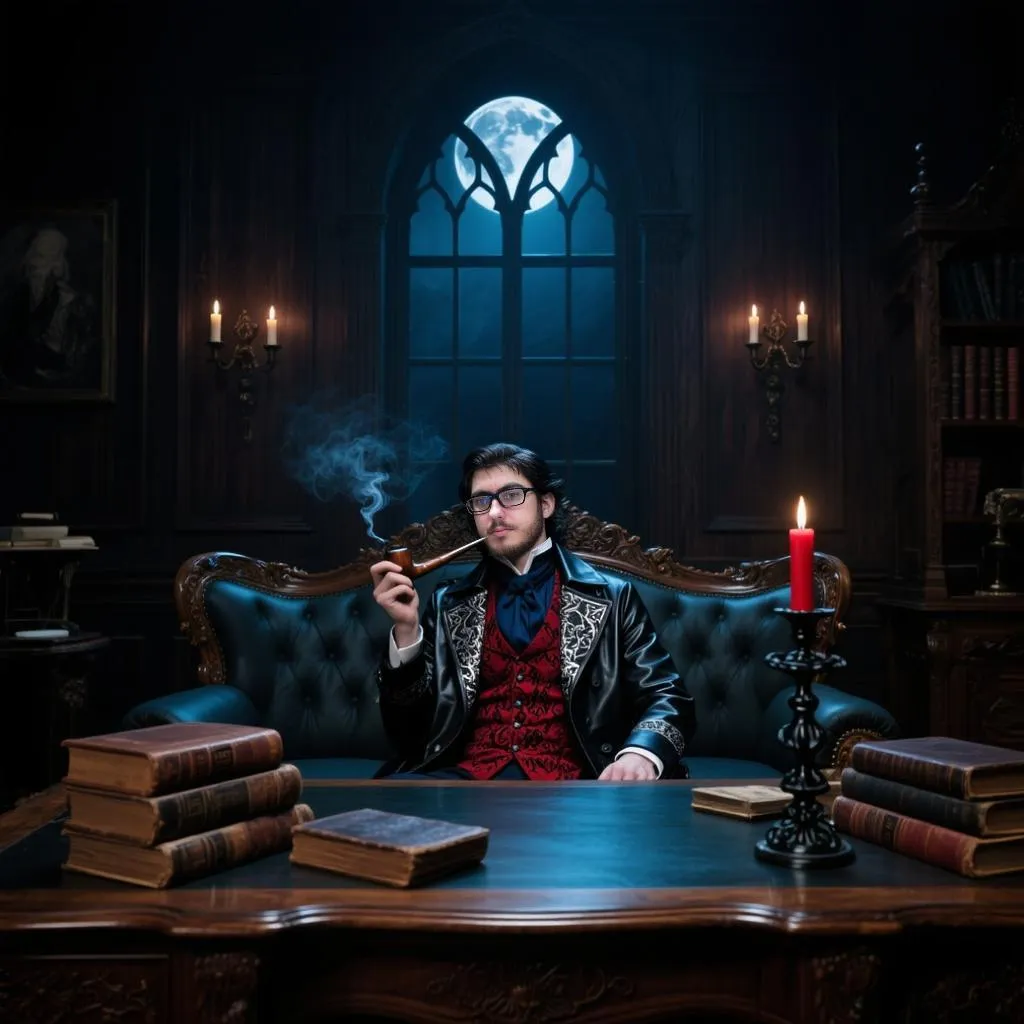 Transform text into Victorian gothic AI art. Generate a dark-academic scene: a composed man in deep red/blue attire, smoking a pipe behind an ornate desk with leather books and candlelight. Moonlight streams through a gothic window in a richly paneled room. Create moody, elegant AI images with professional-grade tools at vivago.ai.
