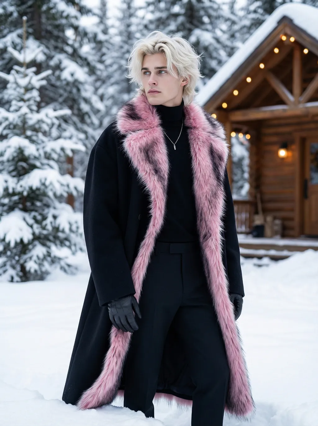 Use the exact same facial features, gender, and age as the character in the uploaded image. Photorealistic fashion portrait, exact same facial features, gender and age as the character in the uploaded image. Platinum blonde, voluminous, slightly tousled hair with a wolf-cut style. Head turned to the left, gaze directed outward with a cool, ethereal expression. Dressed in an oversized, floor-length black wool coat with a dramatic, fluffy pink-and-black gradient fur trim along the edges, open to reveal a sleek black turtleneck and tailored black trousers. A delicate silver necklace adorns the neck, and black leather gloves cover the hands. The setting is a snowy, winter wonderland, with deep, fresh snow covering the ground and snow-laden evergreen trees in the background. A rustic wooden cabin with warm, glowing string lights is visible in the distance. Soft, cool natural daylight illuminates the scene, casting gentle shadows on the snow and clothing. The background is softly blurred, creating a shallow depth of field. The overall mood is avant-garde, ethereal, and effortlessly cool. High detail skin texture, cinematic lighting, 8K resolution, ultra-realistic, high-fashion editorial aesthetic, no text or watermarks.