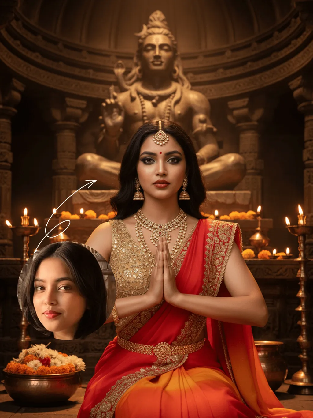The identity of the uploaded portrait is strictly preserved (retaining facial contours, authentic Indian skin tone, hairstyle and age). This is a bust portrait featuring a young Indian woman (aged 20-25) embodying a goddess, with a sacred and solemn demeanor and highly ritualistic makeup: smoldering smoky eyes with a profound, icy allure, paired with a matte true red lip, and a teardrop-shaped red bindi adorned between her brows. Her voluminous black wavy curls fall naturally, and an ornate maang tikka inlaid with rubies and micro-diamonds rests on her forehead, exuding the solemnity of a divine being. She is dressed in a sacred sari with a red-to-orange gradient: the sleeveless blouse is fully embroidered with golden interlocking floral patterns, the sari’s edge is trimmed with woven gold, and an intricately carved gold waist chain cinches her waist. She adorns herself with a full set of elaborate heavy gold jewelry, including multi-layered openwork carved necklaces, dangling gold earrings, and multiple pairs of bangles and arm cuffs, all embodying unparalleled luxury and divine grace. She sits upright before the altar of a millennial Hindu temple, with her hands pressed together in Anjali Mudra, her gaze fixed firmly on the camera with unwavering resolve. The background is the interior of an ancient Hindu temple, featuring dark brown bronze domes and carved stone pillars, with a statue of Shiva standing in the distance. The altar is adorned with brass candlesticks and offering bowls brimming with marigolds and jasmine, and the flickering candlelight casts a sacred aura over the scene. Epic cinematic lighting is employed: warm golden backlight outlines her figure and gilds her hair with a shimmering halo, making each strand glint with golden light; side light illuminates her facial features and the intricate textures of her attire, with dramatic contrast between light and shadow that accentuates her divine radiance. The style is a religious-themed portrait blending realism and mythology, boasting ultra-high definition and exquisite detail, rich and saturated colors, and an immersive, all-encompassing atmosphere – as if the goddess has stepped straight out of an Indian epic. The overall impression is one of sacred magnificence and dazzling radiance.