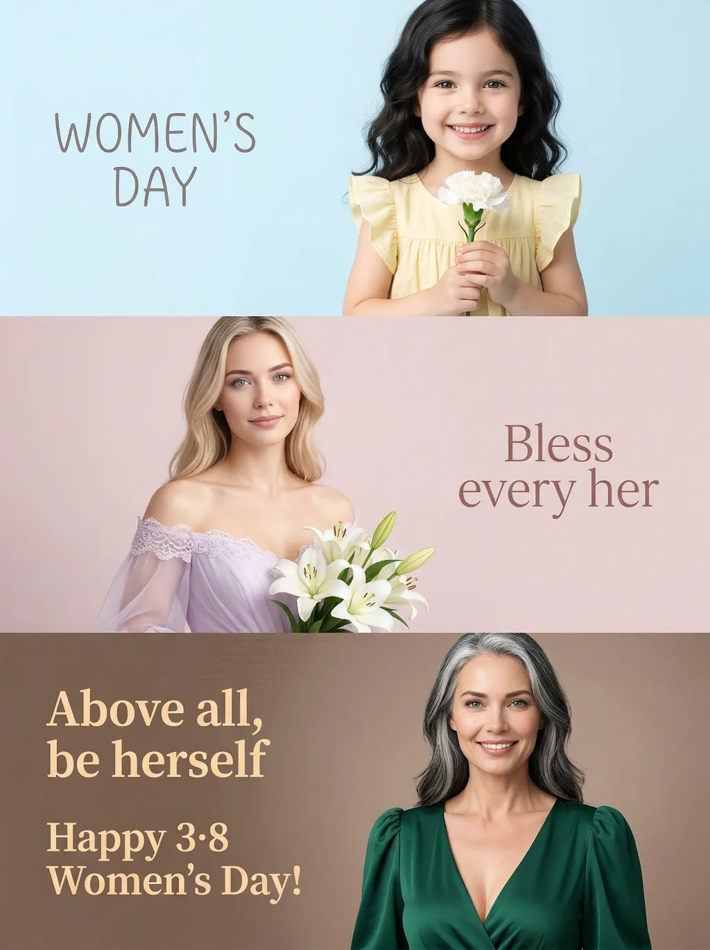 Use the exact same facial features, gender, and age as the uploaded image. A triptych studio portrait, paying tribute to International Women's Day through three unique yet interconnected scenes, with gradient cool-to-warm background colors for each panel to enhance visual rhythm: Top panel (childhood scene): The model as a child, about 5 years old, with soft dark hair, wearing a light yellow ruffled dress, holding a white carnation and smiling brightly at the camera. The background is a pale sky blue gradient. The text "WOMEN'S DAY" appears on the left in a delicate, playful font. Middle panel (youth scene): The same woman, wearing a soft lavender off-shoulder wedding-style dress with lace trim, holding a bouquet of white lilies, gaze gentle and hopeful. The background is a muted blush pink gradient. The text "Bless every her" is displayed on the right in an elegant, flowing font. Bottom panel (senior scene): The model in her senior years, about 60 years old, with salt-and-pepper (black and white intermingled) hair, wearing a deep emerald green deep V-neck puff-sleeve dress, confident and calm, smiling directly at the camera. The background is a warm taupe brown gradient. The texts "Above all, be herself" and "Happy 3·8 Women's Day!" appear on the left in a warm, bold font. The overall style is minimalist, bright and soft, with high-key lighting, ultra-realistic details, and a clean modern design, highlighting the theme of women's diverse identities across life stages.