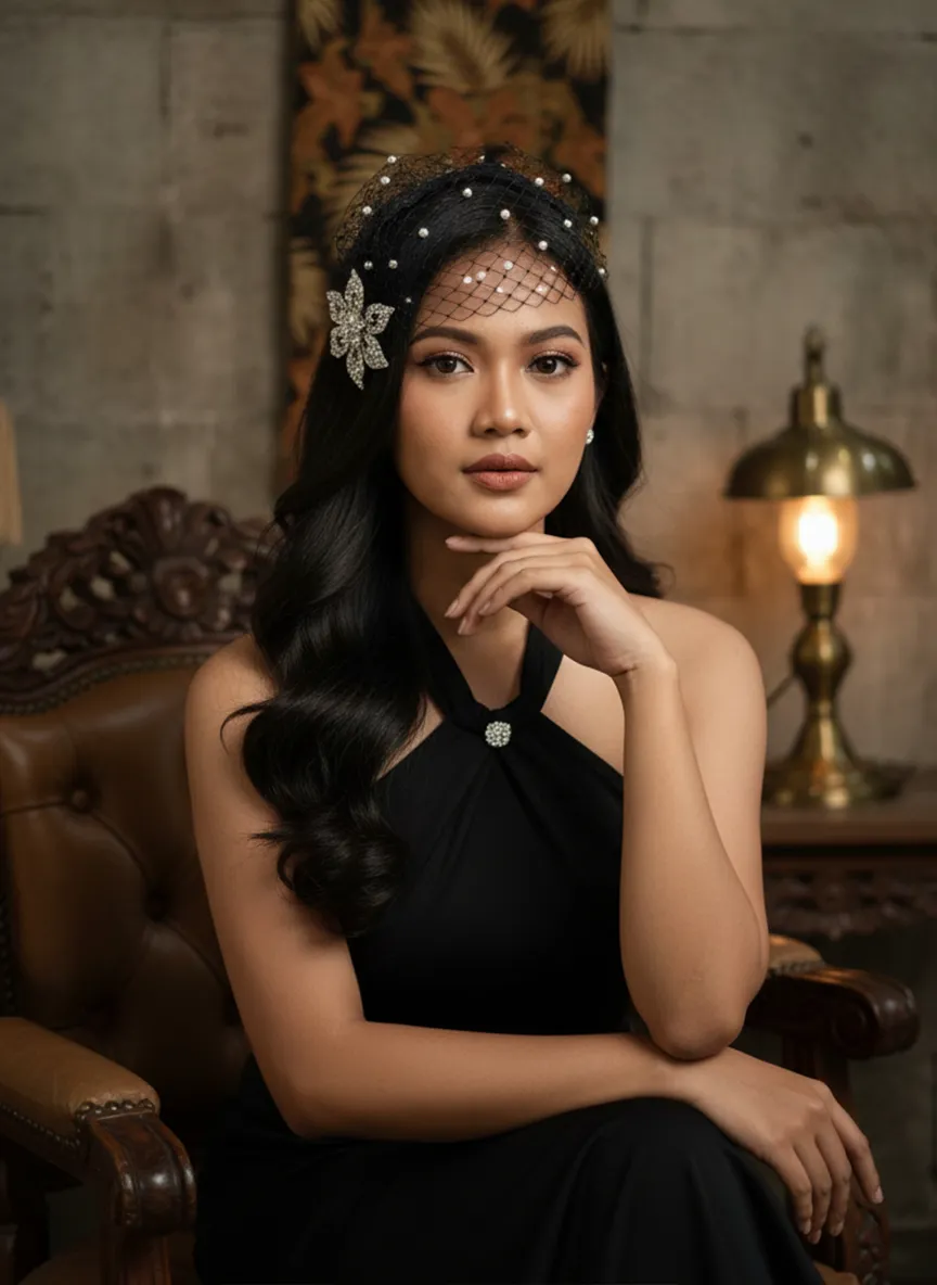 Strictly lock the facial features of the uploaded portrait (preserve facial contours, native Indonesian skin tone, hairstyle and age). photorealistic 3:4 half-body portrait of a delicate young Indonesian woman in her early 20s, with long black wavy hair and soft glamorous makeup, wearing a black mesh fascinator adorned with tiny pearls and a large sparkling diamond flower brooch, a sleek black halter dress with a small diamond accent at the neckline. Model occupies 3/4 of the frame, the model as the absolute dominant subject, close-up half-body portrait with minimal background space, no excessive empty space around the model. She sits on a vintage brown leather chair with intricate Balinese wooden carved details with one hand gently resting on her chin, set against a textured weathered Balinese stone wall adorned with traditional batik wax-print fabric tapestries and tropical palm leaf motifs with a dim warm glowing Indonesian brass table lamp in the background, soft moody ambient lighting creating a mysterious and glamorous Indonesian vintage ambiance, ultra-high detail, cinematic texture, shallow depth of field