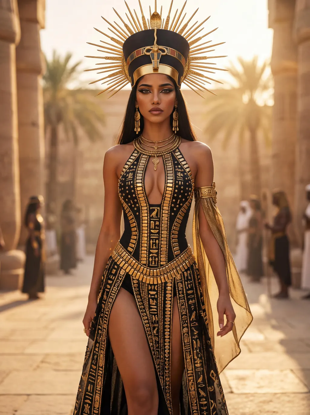 The character in the uploaded picture (unchanged facial features, gender and age). A striking young woman embodying an ancient Egyptian-inspired high-fashion model, captured in a hyper-realistic, cinematic full-body portrait. She has long, straight dark hair, a regal, intense gaze, and bold, dramatic Egyptian-style makeup. She wears an opulent, sun-inspired ensemble in black and gold. Her head is adorned with a massive, elaborate headdress featuring a central black and gold crown, surrounded by radiating golden sun rays, creating a divine, solar aura. Her upper body is clad in a form-fitting, halter-style bodysuit with a deep, intricate cutout at the chest, crafted from black fabric and embellished with countless golden metallic plates, beads, and gemstones, forming geometric and hieroglyphic-inspired patterns. The bodysuit transitions into a high-slit skirt of the same black and gold design, cascading down her legs, revealing her thigh. She wears large, dangling golden earrings, multiple layered golden necklaces, and a detailed golden arm cuff on her right arm, from which a flowing black and gold fabric drapes. She walks forward with a confident, regal stride, her posture upright and commanding, radiating power, divine authority, and ancient mystique. The setting is a high-fashion runway set within a grand, sun-drenched ancient Egyptian courtyard. Massive stone columns and palm trees rise in the background, bathed in the warm, golden light of the setting sun, which creates a hazy, ethereal glow. Indistinct figures of other models in similar attire follow in the background, enhancing the sense of a grand procession. The image is rendered in a hyper-realistic, high-fashion editorial style, with sharp focus on the subject, soft bokeh on the background, and dramatic, cinematic lighting that accentuates the metallic sheen of the gold, the texture of the black fabric, and the intricate details of the headdress and embellishments. The color palette is rich and opulent, featuring deep blacks, radiant golds, and warm, sunlit tones, creating a timeless, powerful, and awe-inspiring atmosphere. The overall aesthetic is detailed, lifelike, and reminiscent of a cutting-edge fashion show set in ancient Egypt, blending historical grandeur with modern high fashion