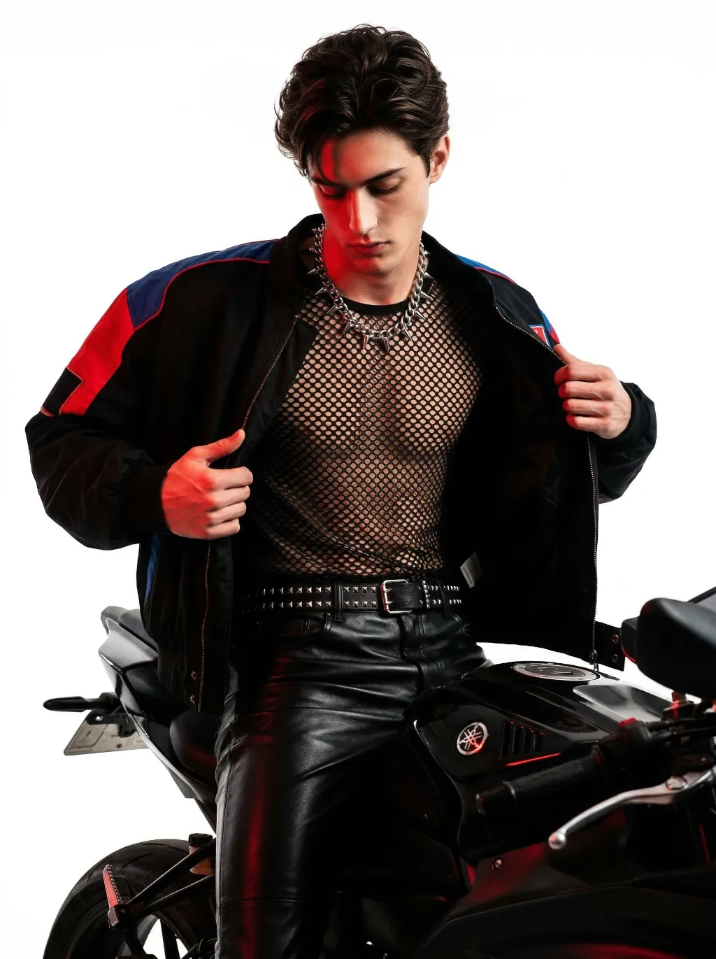 Maintain the exact same facial features, gender, and age as the person in the uploaded image. Fashion editorial male portrait, a handsome young man in his early 20s, sitting on a black sportbike motorcycle, head tilted down, gaze directed downward, one hand pulling open his jacket to reveal his upper body. He has voluminous textured black hair, wearing a black fishnet mesh top, a thick silver spike chain necklace, high-waisted black leather pants with a studded wide belt, and an oversized black racing jacket with red and blue shoulder accents draped open on his shoulders. Lighting: dramatic red key light casting deep shadows on his face and body, high-contrast chiaroscuro lighting, strong side lighting to create a cool, arrogant, and imposing aura, red tone color grading, no other text or logos on the image. Background: pure clean white studio background, shallow depth of field, cinematic film grain, hyper-detailed textures of fishnet, leather, and metal, 8K resolution, shot with Sony A7R V, 50mm f/1.4 lens, sharp focus on the man's face and upper body, conveying a sense of coolness, arrogance, and strong visual pressure.