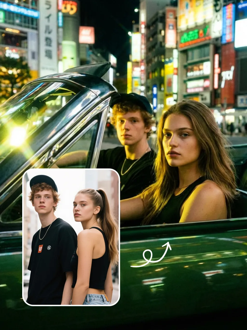 将画面中的两个角色置于车内,一个坐在驾驶座上,另一个坐在副驾驶座上。驾驶者的角色手放在方向盘上。侧面拍摄,人物特写,人物看向摄像机。场景:夜晚的车内(一辆深绿色的复古汽车), 背景是东京夜晚城市,霓虹灯氛围感,风格:亚文化:2000 年代,低饱和度的胶片滤镜,前卫的杂志风格:一位司机和一位副驾驶人物坐在一款时尚的墨绿色敞篷车里,强烈的阳光形成鲜明的高对比轮廓,黄绿色对比光影感,镀铬装饰和玻璃表面反射出太阳光芒,她的头发飘扬着。以时尚杂志的编辑肖像风格呈现,有明亮的镜片光晕和戏剧性的黄绿光影对比。