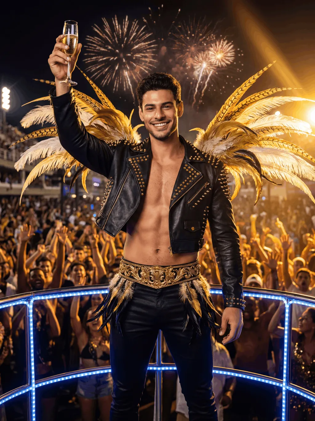 The character in the uploaded picture (unchanged facial features, gender and age). with short dark hair, light stubble, strong jawline, expressive eyebrows, and a bright confident smile, facing the camera directly. standing triumphantly on a Carnival float at night, raising a champagne flute high in celebration. wears a black leather cropped jacket decorated with gold studs and spikes, partially open at the chest, paired with fitted black pants and a wide ornate gold belt with intricate detailing. Black-and-gold feathered accents decorate hips, and large golden and white feathers extend dramatically from shoulders.Behind is a massive cheering Carnival crowd, hands raised in excitement. Fireworks explode in the dark night sky. Powerful golden stage lights beam across the scene, creating dramatic rim lighting and warm highlights. A blue LED-lit railing frames the foreground. The atmosphere is electrifying, luxurious, and celebratory. High-resolution cinematic photography, dramatic lighting, ultra-sharp focus, shallow depth of field, rich saturated colors, dynamic contrast, professional festival photography, 85mm lens, f/1.8, HDR, ultra-detailed skin texture