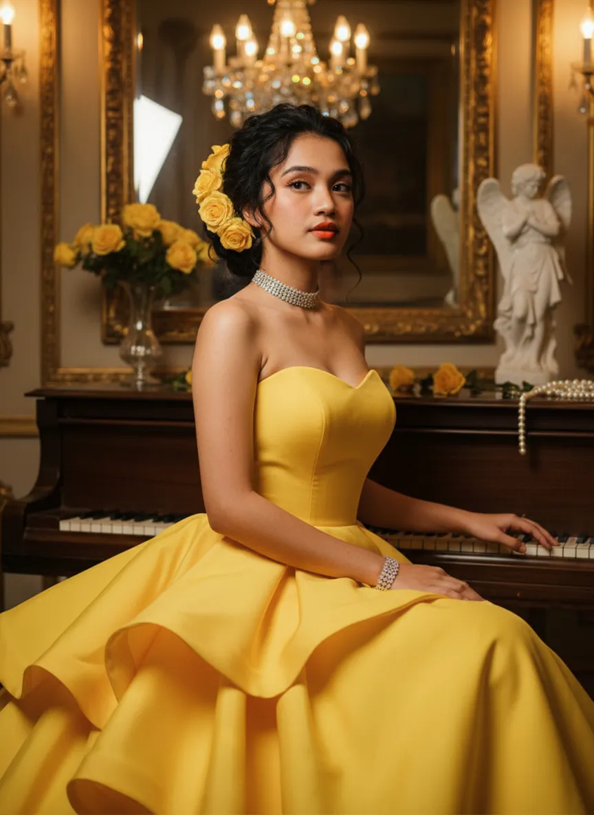 The character in the uploaded picture (unchanged facial features, gender and age). A striking woman with long, sleek black straight hair, embodying a powerful jungle queen, captured in a hyper-realistic, cinematic portrait. She has a regal, intense gaze, and bold, dramatic makeup. She wears a form-fitting, strapless purple bustier dress that accentuates her curvy, graceful figure. She is adorned with a large, imposing golden crown on her head, and a thick, ornate golden necklace with a prominent pendant around her neck. She leans forward, resting her forearms on a weathered stone ledge at the edge of a shallow pool, her hands submerged in the clear, still water. A majestic black panther with sleek, glossy black fur rests calmly beside her, its body partially visible behind her, exuding a sense of primal power and quiet companionship. The setting is a lush, dense tropical jungle. Towering palm trees and broad-leafed plants fill the background, their vibrant green leaves creating a dense, verdant canopy. Soft, dappled sunlight filters through the foliage, casting a warm, golden glow on the scene and creating a serene, otherworldly atmosphere. The image is rendered in a hyper-realistic, cinematic style, with sharp focus on the subject, soft bokeh on the background, and dramatic, natural lighting that accentuates the rich purple of her dress, the glossy black of the panther's fur, and the intricate details of the golden crown and necklace. The color palette is rich and vibrant, featuring deep purples, glossy blacks, radiant golds, and lush greens, creating a timeless, powerful, and awe-inspiring atmosphere. The overall aesthetic is detailed, lifelike, and reminiscent of a scene from a grand fantasy epic, blending primal power with regal elegance