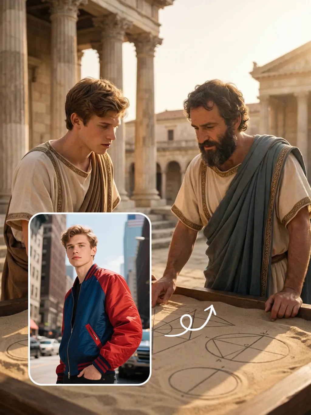 图中的人物与阿基米德在古叙拉古,在沙盘上研究几何,大理石柱,柔和的金色阳光,超写实细节,特写镜头近景拍摄,电影级光影,古希腊风格,8K 分辨率