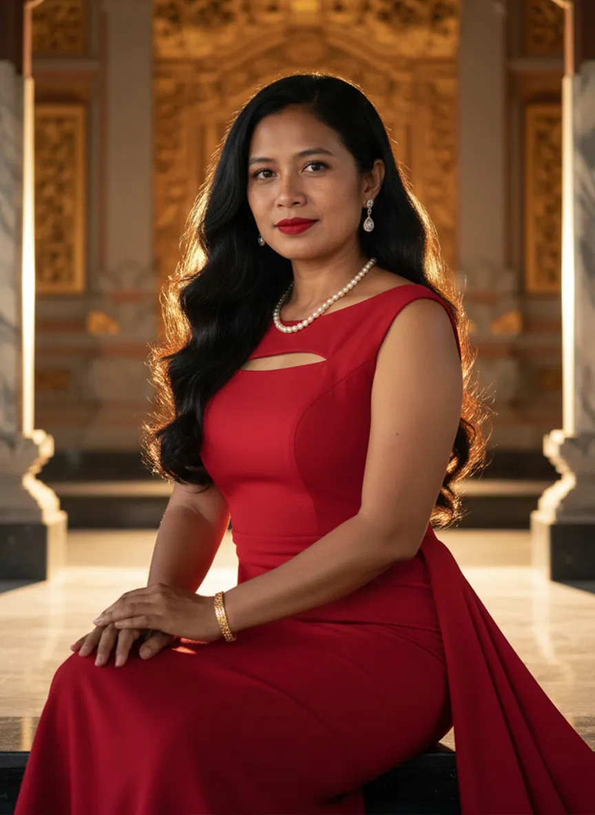 Strictly lock the facial features of the uploaded portrait (preserve facial contours, native Indonesian skin tone, hairstyle and age). A glamorous half-body portrait of a young Indonesian lady in her 20s, with striking facial features, vivid red lips and long flowing black wavy hair that shimmers under warm light. She dons a glamorous red evening gown with a sleek figure-hugging silhouette, subtle cutout details and a flowing train, exuding sensuality and graceful allure, paired with delicate pearl necklace, drop earrings and gold bracelet. Bathed in soft golden backlight that creates a stunning hair glow effect, set against a grand and opulent Indonesian palace interior with intricate Balinese wooden carvings, gilded golden ornaments, marble columns, traditional Javanese architectural details and soft ambient palace lighting, exuding timeless elegance, retro charm and majestic Indonesian royal ambiance, 3:4 aspect ratio, ultra-high detail, photorealistic, cinematic texture