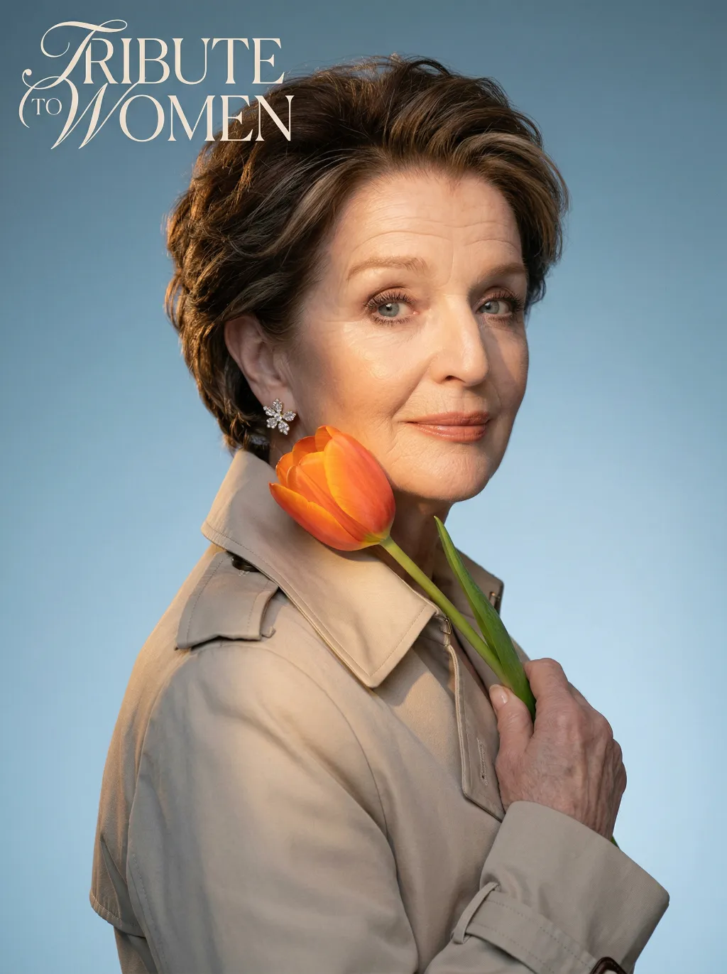 Use the exact same facial features, gender, and age as the uploaded image.Studio portrait, half-body shot. standing sideways, holding a vibrant orange tulip gently against the cheek. Wearing a light beige trench coat with a structured collar, adorned with delicate sparkling floral earrings. The background is a smooth cool blue gradient, creating a minimalist and sophisticated atmosphere.Soft warm side lighting casts gentle shadows on the face, highlighting the skin texture and the luster of the tulip petals. Medium close-up composition, focusing on the calm and gentle expression of the subject, as well as the strong color contrast between the warm tones of the flower and clothing against the cool background. The image features cinematic color grading, high detail, and ultra-realistic quality. The text “TRIBUTE TO WOMEN” is artistically integrated into the upper left corner as stylized art font, harmonizing with the portrait’s elegant tone without overwhelming the visual.