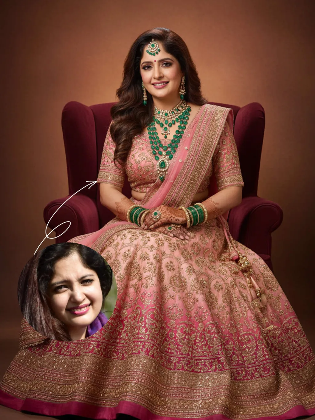 The identity of the uploaded portrait is strictly preserved (retaining facial contours, authentic Indian skin tone, hairstyle and age). The subject is an elegant and opulent mature Indian woman aged 40 to 50, with exquisitely gentle makeup: a fresh, sheer base paired with soft eye makeup and a bean paste red lip, emanating an air of poised grace. She is dressed in an intricately hand-embroidered pink-and-gold gradient Lehenga Choli: the blouse is a slim-fit short-sleeve style fully adorned with elaborate embroidery interwoven with gold and pink threads; a matching Dupatta is draped elegantly over her shoulders. The flared full skirt is covered with gold embroidery of geometric and floral patterns, edged with a pink trim. She adorns herself with a full set of emerald jewelry, including an emerald and micro-diamond inlaid Maang Tikka, dangling emerald earrings, a multi-layered emerald necklace, wide carved emerald bangles and a matching ring. Her hands are decorated with traditional delicate Mehndi henna tattoos with intricate and fine patterns. She sits elegantly on a burgundy velvet armchair, her body leaning slightly forward, hands folded and resting on her legs, the skirt draping and spreading naturally, fully embodying an aura of poised luxury. The background is a textured art paint wall with a warm brown-red gradient, kept simple without excessive decorations. Soft warm-toned studio lighting is adopted: the key light illuminates the subject’s entire body, and fill light defines her contours, highlighting the translucency of the emerald jewelry and the luster of the embroidery. The style is a high-end portrait of an Indian aristocratic lady blending traditional aesthetics, featuring ultra-high definition and delicate details, rich and saturated colors, and creating a luxurious and serene atmosphere.