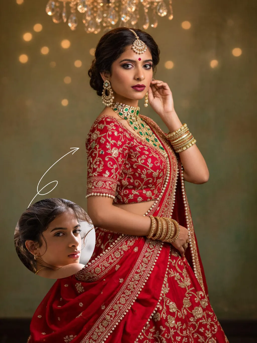 The identity of the uploaded portrait is strictly preserved (retaining facial contours, authentic Indian skin tone, hairstyle and age). This is an upper-body portrait with a 3:4 aspect ratio, capturing her facial features with sharp clarity. The subject is an elegant and opulent Indian woman with exquisite makeup: deep defined eye makeup paired with a matte true red lip, and a red bindi adorned on her forehead. Her hair is styled into a graceful updo, with a golden maang tikka inlaid with micro-diamonds and pearls resting on her forehead. She is dressed in a luxurious traditional Indian red Lehenga Choli: the blouse is a slim-fit short-sleeve style fully embellished with intricate golden heavy hand-embroidery and inlaid with emeralds; the flared long skirt is crafted from red satin, entirely covered with elaborate golden vine and floral embroidery and edged with a delicate white beaded trim. A matching red dupatta is draped elegantly over her shoulders and arms. Around her neck, she wears stacked ornate necklaces encrusted with emeralds and gold ornaments, with openwork carved gold earrings at her ears and multiple layers of golden bangles and bracelets adorning her hands. She strikes an elegant pose, turning her head back in a side profile, one hand gently touching her earring and the other resting on her waist. The skirt drapes and spreads naturally, exuding a classical and gentle sense of movement. The background features a retro weathered art paint wall with a green-brown gradient, with a large crystal chandelier hanging overhead; warm golden light refracts through the crystal to cast soft light spots, and the floor is finished with dark matte wood. Professional portrait lighting is employed: a warm-toned key light illuminates her entire body, while fill light defines her contours, highlighting the luster of the garment’s embroidery and the translucent texture of the jewelry. The style is a retro palace-inspired Indian wedding portrait, boasting ultra-high definition and delicate details, rich and saturated colors, and creating an atmosphere of luxury and elegance.
