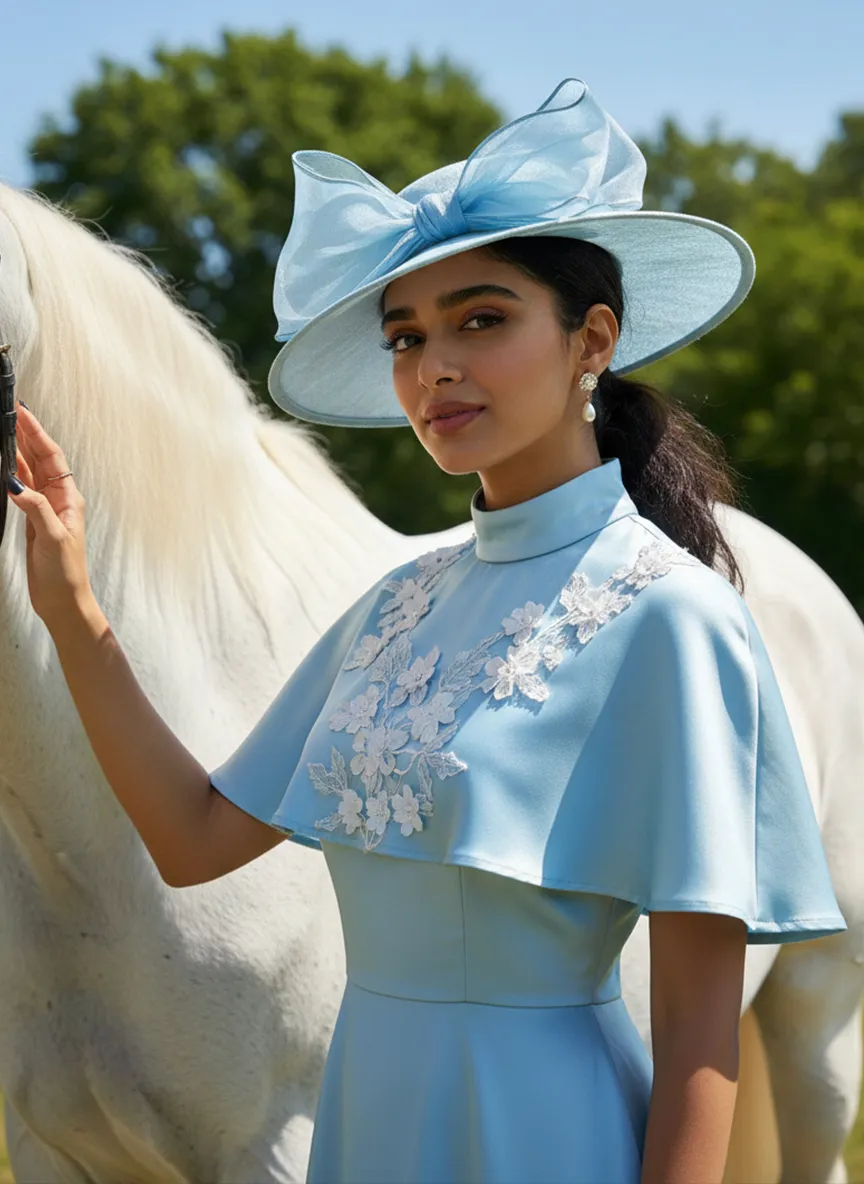 Strictly lock the facial features of the uploaded portrait (preserve facial contours, native Indonesian skin tone, hairstyle and age). photorealistic 3:4 half-body portrait of a graceful young woman in her early 20s, with delicate facial features, wearing a light blue satin vintage-style dress with a matching wide-brimmed hat adorned with a sheer blue bow, white floral embellishments on the dress and capelet, pearl drop earrings. She stands beside a majestic white horse, gently touching the horse's neck, set against a clear bright blue sky with lush green trees in the background, bright natural sunlight, fresh equestrian vintage ambiance, ultra-high detail, cinematic texture