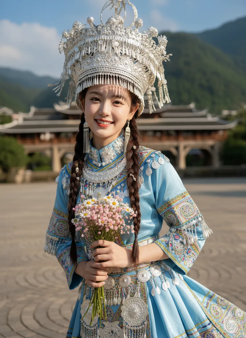 Strictly lock facial features: fully preserving the original facial contours, skin texture, eye shape, lip shape, and youthful appearance with zero deviations allowed. Eye-level perspective, close-up half-body portrait (subject occupies 80% of the frame), a young and sweet East Asian woman with a bright, healing smile showing teeth, eyes bright and gentle; double braid hairstyle with small silver ornaments in the hair; wearing an extremely ornate and intricate Miao silver large-horned headdress with dangling silver tassels swaying subtly; accessorized with multi-layered Miao silver collars and long silver earrings. Natural dynamic pose: Body gently tilted forward, arms positioned naturally: one hand gently holds a small bouquet of fresh flowers (a mix of light pink baby's breath and white daisies), fingers loosely wrapping around the flower stems, the bouquet naturally tilting downward toward the camera, petals slightly fluttering; the other hand rests lightly at her waist for an organic, relaxed feel, shoulders slightly relaxed, no stiff movements. The upper portion of the light blue satin Miao traditional costume’s skirt flows subtly, with the decorative silver trim and embroidery fluttering gently in the breeze—focusing on upper-body movement only. The top has wide sleeves, with large areas of silver embroidery, colorful small bead decorations, and gold trim on the cuffs, neckline, chest, and waistband, catching soft highlights with the gentle movement. Soft natural sunlight shines from the upper left side of the frame, casting warm, translucent highlights on the Miao silver ornaments, flower petals, hair strands, and satin fabric; natural soft shadows form on the neck, collarbone, and the edge of the costume, enhancing the three-dimensional sense of the figure while maintaining the fresh and transparent tone. Background (subtly blurred to emphasize the subject): The stone slab square of Xijiang Qianhu Miao Village in Guizhou (partial concentric circle patterns visible), with a blurred wooden wind-rain bridge and lush green mountains in the distance, under a fresh blue sky with clouds; overall high-definition portrait photography, soft diffused natural light blended with warm sunlight, colors are fresh and transparent, mainly in light blue, silver white, and natural green tones, strictly 1:1 replicate the original image's facial features and clothing details while emphasizing the subject's dominance in the frame