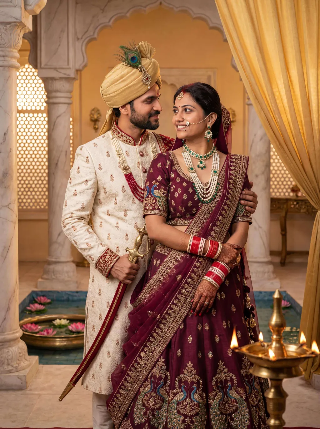Both individuals in the uploaded image retain their original facial features, gender, and age. One is dressed in an ivory-white sherwani (traditional Indian men's formal wear), intricately embroidered with red and gold floral motifs. He wears a golden turban adorned with a vibrant peacock feather. A decorative talwar (Indian sword) with a green gem-encrusted hilt is sheathed at his waist. He stands behind the other, his arms gently wrapped around her, gazing at her with a loving gaze. The other is adorned in a deep burgundy lehenga choli (traditional Indian women's formal wear), featuring elaborate gold threadwork and peacock feather embroidery. A matching dupatta (scarf) is draped over her head and shoulders. She wears a multi-layered pearl necklace with a large emerald pendant at its center, a traditional nose ring, red sindoor (vermilion) on her forehead, and multiple red and white bangles stacked on her wrists. She looks back at him with a soft, affectionate expression. The scene is set in a luxurious palace courtyard, surrounded by white marble pillars and intricate jali (lattice) screens, with a tranquil pond filled with pink and white lotus flowers. Sheer golden curtains frame the scene, and a traditional brass diya (oil lamp) burns brightly in the foreground, casting a warm, golden glow. The overall atmosphere is opulent, romantic, and timeless, rendered in a classic studio portrait style with rich, saturated colors, soft lighting, and distinct light and shadow on the subjects