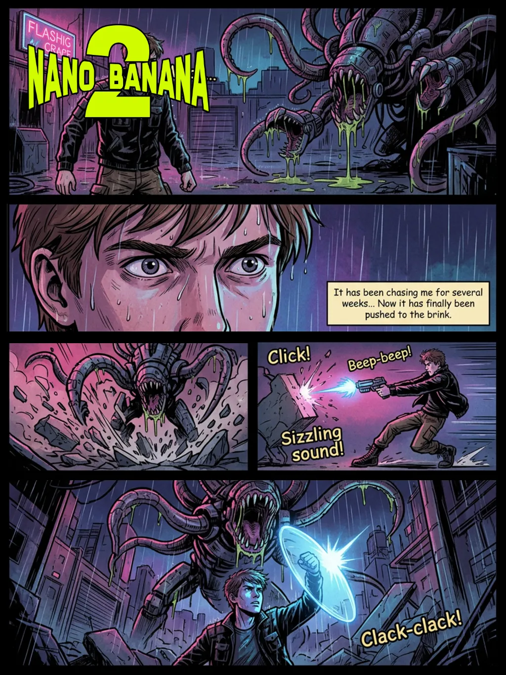 American comic book pages, film narrative techniques, film storyboard aesthetic, dramatic widescreen composition, melancholic light-dark contrast and shadowing, high-contrast shadows, rough textures, dynamic action scenes, emotionally intense close-up shots, epic panoramic shots, retro-futuristic horror atmosphere, bold line art, soft color combinations with neon tones, professional comic book illustrations, 8K resolution, ultra-detailed environment, sound effects annotations, dialog boxes, film lens halos, depth-of-field effects. Page 1: A panoramic close-up shot of the night, in the picture is a rain-soaked and abandoned industrial area. A young heroic figure (with the character in the previous picture as the main body, maintaining facial features, gender, and age unchanged), with rough outlines, brown short hair, wearing a worn-out black tactical jacket, work pants, and combat boots), stands at the front of the picture, facing away from the flashing neon sign. His expression is stern, one hand holding a glowing plasma pistol. In the shadows, a huge mechanical monster creature looms - with twisted tentacles and metal mouths dripping viscous acid. Sound effect: "Whoo..." Page 2: Close-up shot of the protagonist's face, sweat and rain meeting on his forehead. His gaze is tightly fixed on the monster, his pupils enlarged due to fear and determination. Dialog box content: "It has been chasing me for several weeks... Now it has finally been pushed to the brink." Page 3: Medium shot showing the monster charging forward, its tentacles violently crashing against the concrete ground, raising a large amount of debris. The hero quickly turns sideways to dodge, shooting at close range. Sound effect: "Click!" "Beep-beep!" "Sizzling sound!" Page 4: Full-page opening shot, shot from the protagonist's perspective at a low angle. The monster stands high above him, opening its mouth to prepare to devour him. The protagonist raises a shining energy shield, the light shining on his face casting a desperate blue shadow. The industrial area collapses around them, rain pouring down. Sound effect: "Clack-clack!" -- Style: Film-style comic style -- Aspect ratio: 2.39:1 -- Color: Dim neon color -- Line drawing: Rough -- Shadows: Light-dark contrast -- Layout: Multiple-panel -- Character: 1 -- Monster: 1 -- Weapon: Plasma pistol -- Environment: Industrial ruins -- Atmosphere: Tense and terrifying -- Action: High energy -- Dialogue: Yes -- Sound effects: Yes -- Lens halo: Yes -- Depth of field: Yes