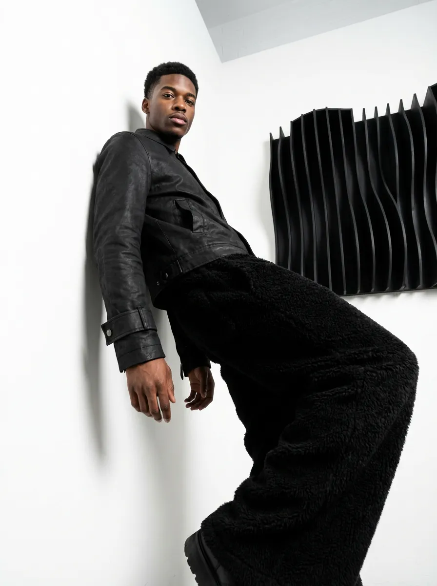 This is a set of professional minimalist style portrait works shot from a low angle. Using a 35mm wide-angle lens, a unique strong perspective distortion effect is presented. This work was taken with a Sony A7R V camera. The uploaded images show the image of the person (with facial features, age and gender unchanged), with neat short hair, matte makeup, highlighting a hard and angular outline, a cold and confident expression, and calm and avant-garde gaze directly at the camera. The body leans against a white matte wall, the right leg is bent and raised, the left arm is placed on the wall, and the right hand is naturally hanging down. Wearing a black worn-out high-end custom leather jacket (with detachable cuffs), a black inner layer, and loose and fluffy black wide-leg pants. The studio uses high-contrast hard light for illumination, with the main light forming a strong contrast line of light and dark in the front, deep shadows, and clear contours. The background is a white matte wall and some black three-dimensional abstract wave-shaped art installations, presenting a strong contrast in visual effect, high contrast, clear texture, and a fashionable and avant-garde photography art style, which can be regarded as a heavyweight work in the fashion world.
