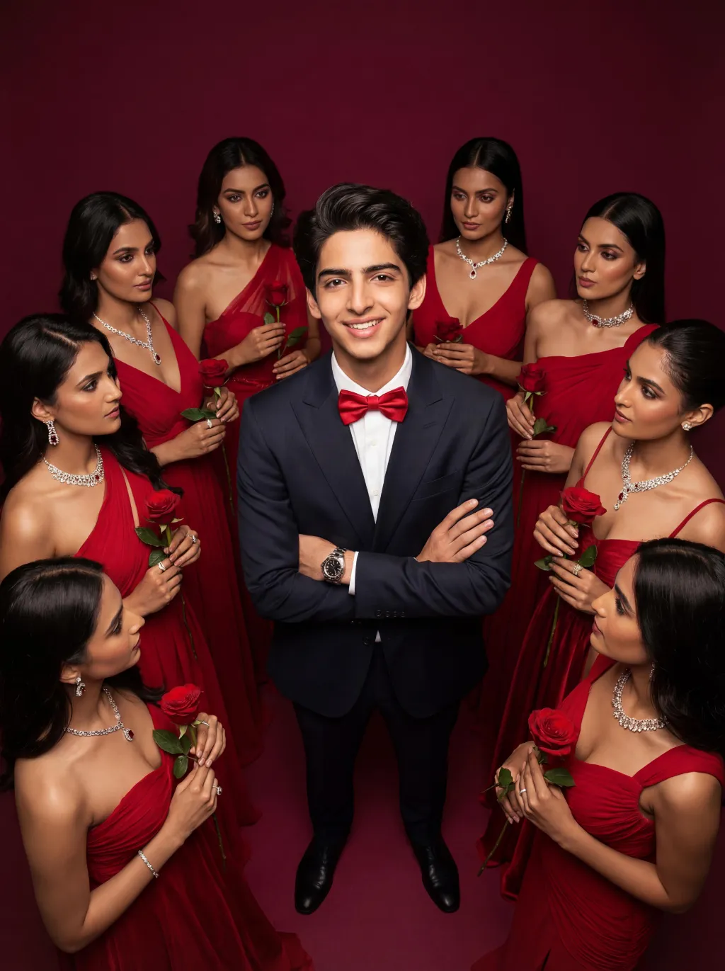 Low-angle shot: The central figure from the uploaded image is the subject, with a confident smile, keeping original facial features, gender and age unchanged. He is dressed in a well-tailored high-end custom suit, paired with a red bow tie and a luxury watch, with his arms crossed over his chest. Surrounding him are 8 to 9 beautiful Indian women in stylish red high-end custom gowns, adorned with luxurious accessories, each holding a fresh red rose. These women are arranged in a circular formation around the central figure against a solid deep burgundy background. Lighting & Color Settings: High-quality cinematic lighting effects, soft yet dramatic shadows, moderate contrast, rich depth of field, smooth and translucent skin texture, creating an overall luxurious and romantic atmosphere, with a faint highlight on the facial features for enhancement. Color Hints: Dominated by rich deep red and pure black, natural and clear skin tones, highly saturated colors without overexposure, a cohesive high-end color palette with warm tones, and striking contrast between light and shadow. Style Supplement: Avant-garde fashion art style, fashion portrait photography, the overall atmosphere is elegant and charming, evoking the grandeur of a luxurious Valentine's Day celebrity gala.