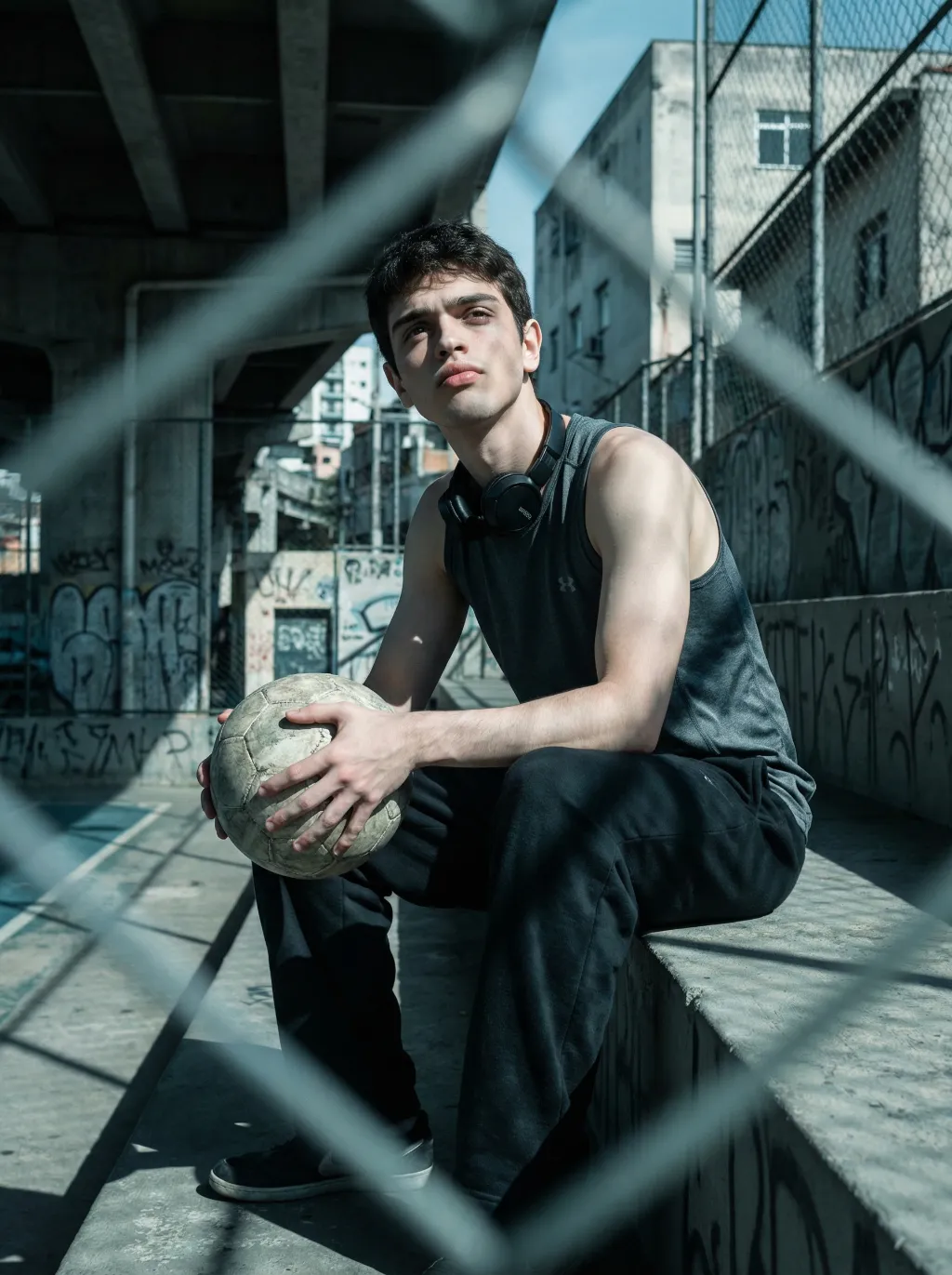 Use the exact same facial features, gender, and age as the character in the uploaded image.Photorealistic urban soccer portrait in São Paulo, street culture style, industrial texture, strong sense of reality and perseverance. Setting: old community court under overpass, concrete stands, wire fence, graffiti walls, city buildings in background. Outfit: dark sports tank top or vintage club jersey, loose sweatpants or jeans, headphones or towel around neck, holding a worn football. Pose: facing forward directly, sitting on stadium stand with head slightly lowered in thought while gaze drifts upward toward the camera, or sitting upright facing forward with distinct shoulder lines, conveying struggle and toughness under urban pressure. Lighting: low saturation cool gray tone, cyan-blue shadows, natural warm skin contrast, strong chiaroscuro, hard light. Composition: medium to long shot, blurred wire fence foreground for layers, symmetrical composition or compressed space, horizontal frame, strict front-facing camera angle centered on the subject. Style: high detail, realistic skin texture, cinematic tone, 8K ultra-realistic, no text or watermarks.