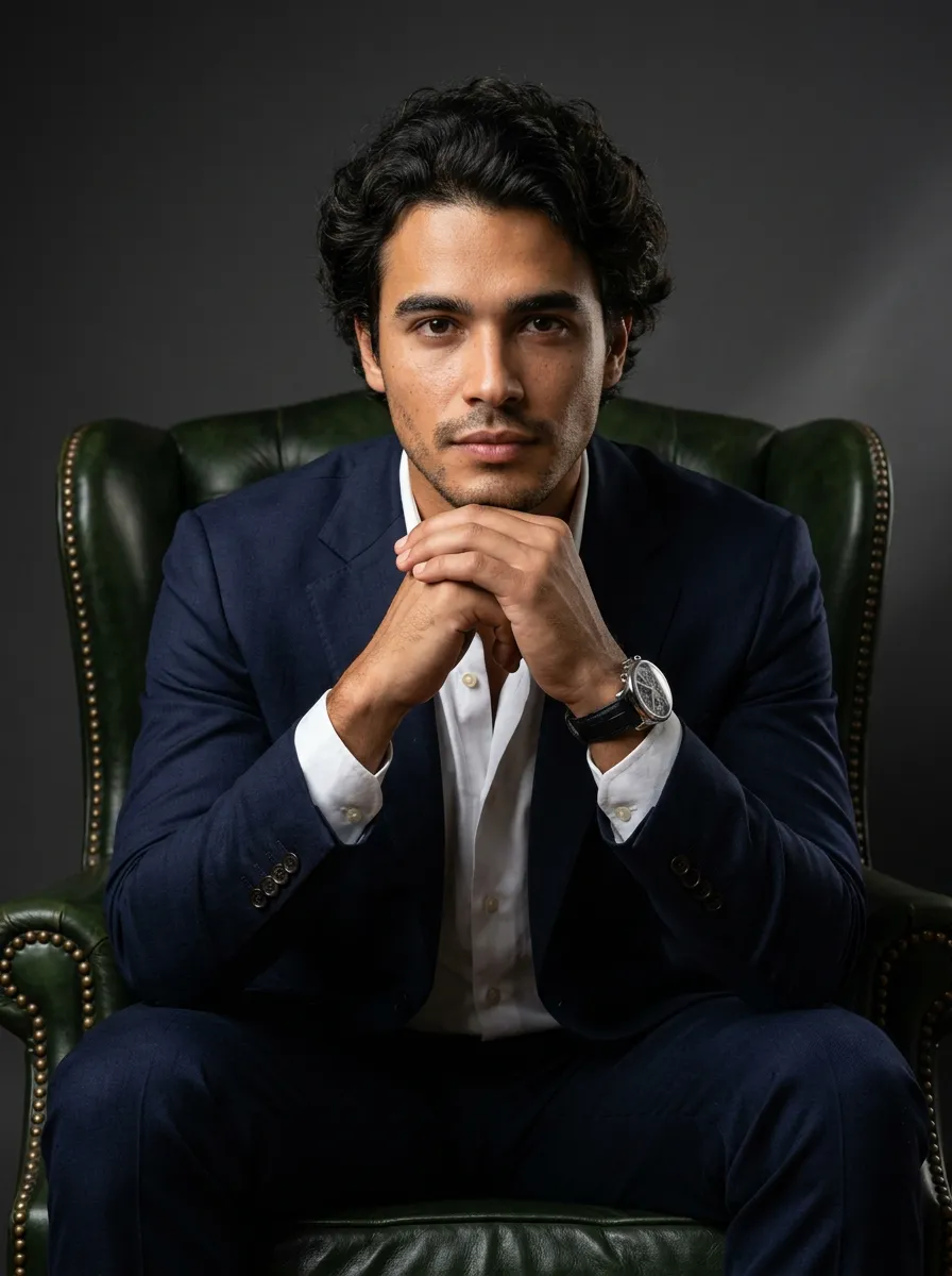 Strict identity verification is conducted using the first uploaded portrait (maintaining consistency in facial features, hairstyle, skin tone and age). An executive with outstanding poise is dressed in a haute couture suit paired with a white dress shirt (with the collar slightly unbuttoned), and a high-end mechanical watch adorns his wrist. He sits elegantly in a dark green vintage leather armchair (exquisitely embellished with delicate rivets and rich textured detailing) against a minimalist dark gray gradient background. His face exudes wisdom and focus with a sharp gaze; his hands are folded beneath his chin in a posture brimming with authority. His facial expression is confident and composed, and his eyes are piercing and decisive. A full-shot perspective is adopted to capture the subject in full view. The overall style adheres to high-end fashion commercial photography with an exquisitely fine texture. The clear texture of the suit and intricate details of the watch are sharply rendered, crafting the image of a professional, wise and self-assured corporate executive. Boasting ultra-high resolution, photorealistic detail, an editorial aesthetic, contemporary fashion photography sensibilities and avant-garde fashion photography style, the portrait features professional studio lighting with stark contrast and a dramatic dark-toned lighting effect. A broad wash of soft side light slants in from the right side of the frame, creating a large-scale Tyndall effect that outlines his facial contours with precision.
