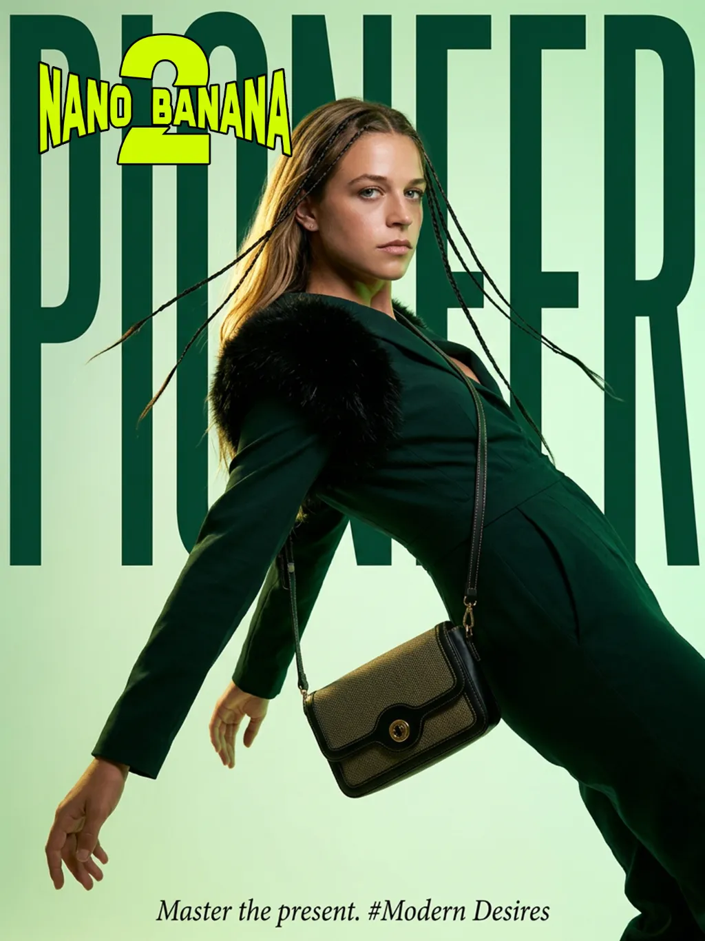 This is the cover of the high-end fashion magazine series, with the title presented in a large, deep green, design-oriented sans-serif font: "PIONEER". The figure is positioned in front of the text (occupying 80% of the overall picture) and is captured in a medium close-up shot. The cover presents a radiant scene (with no changes in facial features, gender, or age), presented through the uploaded image. The expression is serious and cool, with a few flowing and slender black braids, exquisite makeup, exceptionally good skin condition, wearing a well-tailored dark green outfit, with soft black fur decoration on the shoulders, holding a retro high-end custom crossbody bag, the body is in an inclined hanging position, the arms are stretched out, with a charming expression and exquisite makeup. The background is a gradient of light green, the strong contrast of light highlights the facial contours and hair texture. The focal length is 50mm, captured with a professional portrait camera, clear focus, using an elegant editing style, with modern and avant-garde aesthetic style. The exquisite small font layout adds to the content: "Master the present. #Modern Desires"