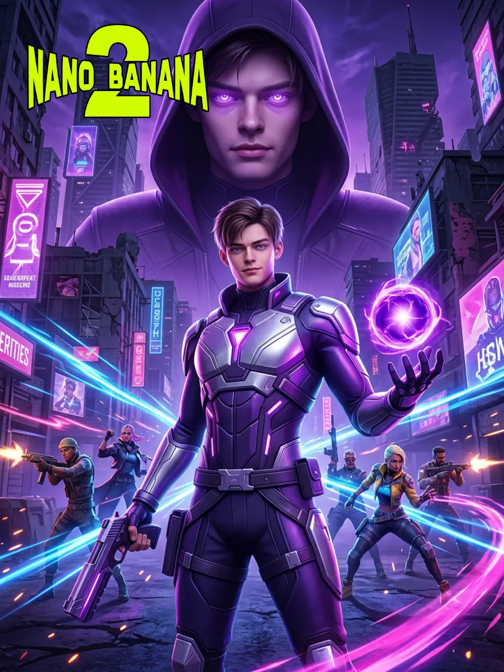 This is an epic cyberpunk combat scene digital image art piece (a combination of 3D and 2D rendering style) based on the "Valorant" character. In the center of the picture stands a confident agent (whose facial features are based on the character design provided in the uploaded image, maintaining the gender and age of the facial features), the main character has short hair and is wearing a futuristic combat suit decorated with silver and deep purple elements, holding a dual-energy gun, and summoning a glowing purple ball. Behind the character, a mysterious huge figure wearing a hood and with a face similar to the character in the uploaded image (whose facial features are based on the character design provided in the uploaded image), has bright purple eyes, looking down at a dilapidated futuristic cityscape. In the background of the picture, other agents appear in dynamic postures, accompanied by neon energy trajectories and broken fragments. The entire picture has a dominant color palette of deep purple, indigo blue, and bright pink, with strong lighting effects and cinematic composition. It is rich in details, with clear lines, bright colors, a resolution of up to 8K, and an artistic style similar to game posters, C4D rendering, OC renderer, Blender rendering, top 3D game style.