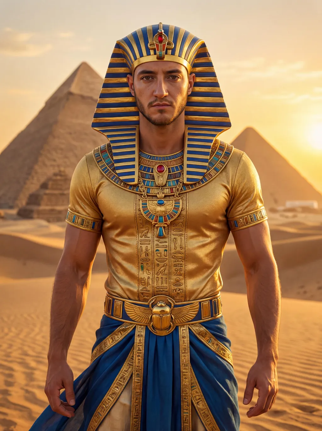 The character in the uploaded picture (unchanged facial features, gender and age). A striking male model embodying the persona of an ancient Egyptian pharaoh, captured in a hyper-realistic portrait. He wears an ornate golden nemes headdress with blue and gold stripes, adorned with a central red gem. His gaze is direct and commanding, exuding a sense of divine authority and regal power. He wears a form-fitting, short-sleeved golden tunic with intricate hieroglyphic embroidery and colorful inlays, showcasing a chiseled, muscular physique beneath the luxurious fabric. His accessories are opulent: a massive, intricately carved golden pectoral necklace with colorful inlays, and a wide golden belt featuring a scarab motif at its center. He wears flowing blue fabric at his waist, trimmed with elaborate gold detailing. He stands regally in the vast, sun-drenched desert of ancient Egypt, his posture upright and confident, radiating primal strength and pharaonic grandeur. The setting is the iconic Egyptian desert, with the majestic pyramids rising in the distance against a clear, golden sky. The desert sand stretches out to the horizon, with the warm, hazy air of the desert surrounding him. The image is rendered in a hyper-realistic, true-to-life portrait photography style, with soft, natural golden-hour lighting that highlights the sheen of the gold, the texture of the fabric, and the stark beauty of the desert and pyramids. The color palette is rich and opulent, featuring deep golds, vibrant blues, and earthy browns, creating a timeless, majestic, and awe-inspiring atmosphere. The overall aesthetic is detailed, lifelike, and reminiscent of a high-fashion editorial photoshoot set in ancient Egypt