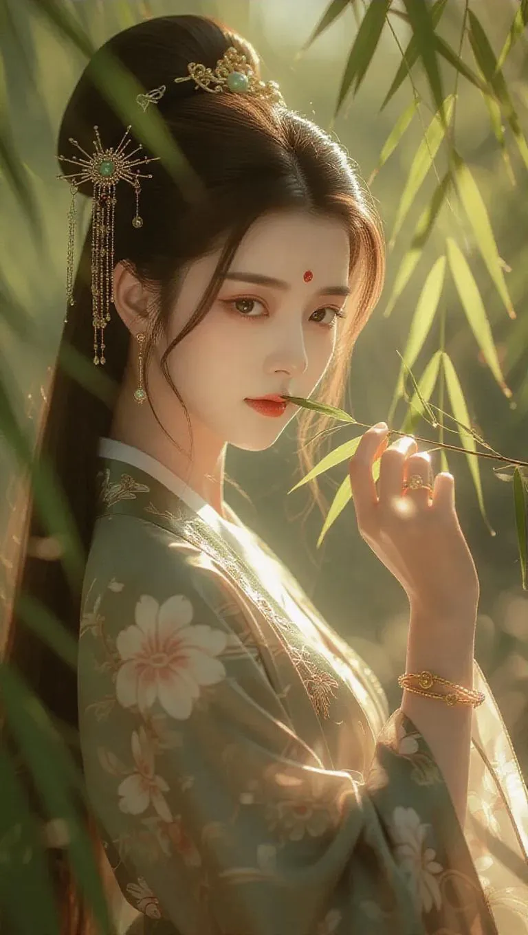 Discover AI-generated Chinese-style art blending ancient elegance with anime soft light. This scene features a mysterious woman in silk robes, jade bangles, and a golden phoenix hairpin gathering mulberry leaves under willow branches. AI effects enhance flowing fabrics, falling leaves, and subtle sparkles, evoking poetic beauty and quiet loneliness. Perfect for creating ethereal, culturally rich visuals with professional AI tools.