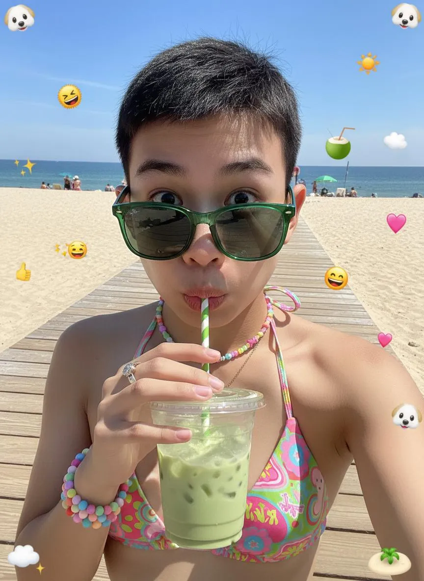 上传图中人物(保持面部特征不变,年龄、性别不变、人物面部自然磨皮,清透的妆容),极度特写自拍镜头,第一人称视角,上传的图中人物贴近相机站立,使用 iPhone 14 拍摄的休闲街头摄影,上传的图中人物睁大眼睛,嘟起嘴唇,夸张的圆睁双眸,生动且俏皮的面部表情夸张的圆睁双眸看向镜头、用一条绿白相间的吸管喝着饮料 、穿着彩色的可爱比基尼,彩色的Y2K风格配饰、大框墨绿色的太阳镜(太阳镜脱落在鼻尖露出人物的眼睛、太阳镜反射周围的景色), 拿着一个透明塑料杯,里面装着浅绿色的冰镇饮料和冰块,阳光明媚的户外照明,清晰的白昼,柔和的阴影,充满活力的自然光线 ,颜色调:亮绿色、深蓝色、浅绿色、暖棕色(木制栈道)、亮蓝色(天空),背景:海滩、海边沙滩、阳光明媚时栈道、充满活力的海边休闲氛围,多巴胺彩色配色、Y2K配饰、Y2K 风格,人物的周围和整个画面上随机散落加入一些可爱的iphone emoji 风格表情贴纸装饰(🐶、☁️、✨、😄、☀️、🥥、🥤、💗、❤️、👍、🐶、🏖️、🏝️),超级大的透视、广角镜头、人物头部大大的