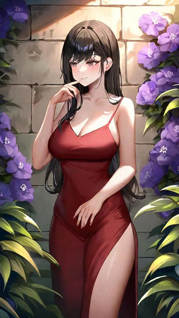 Vibrant anime mural transforms ancient communities with hyperrealistic details. Anime girl with flowing black hair wears red spaghetti strap dress, surrounded by blooming purple flowers and ivy vines. Soft pastel colors blend anime aesthetics with mural textures, creating dreamy urban scenes. Experience calm elegance through hyperrealism, delicate linework, and immersive cityscape ambiance in this AI-generated artwork.