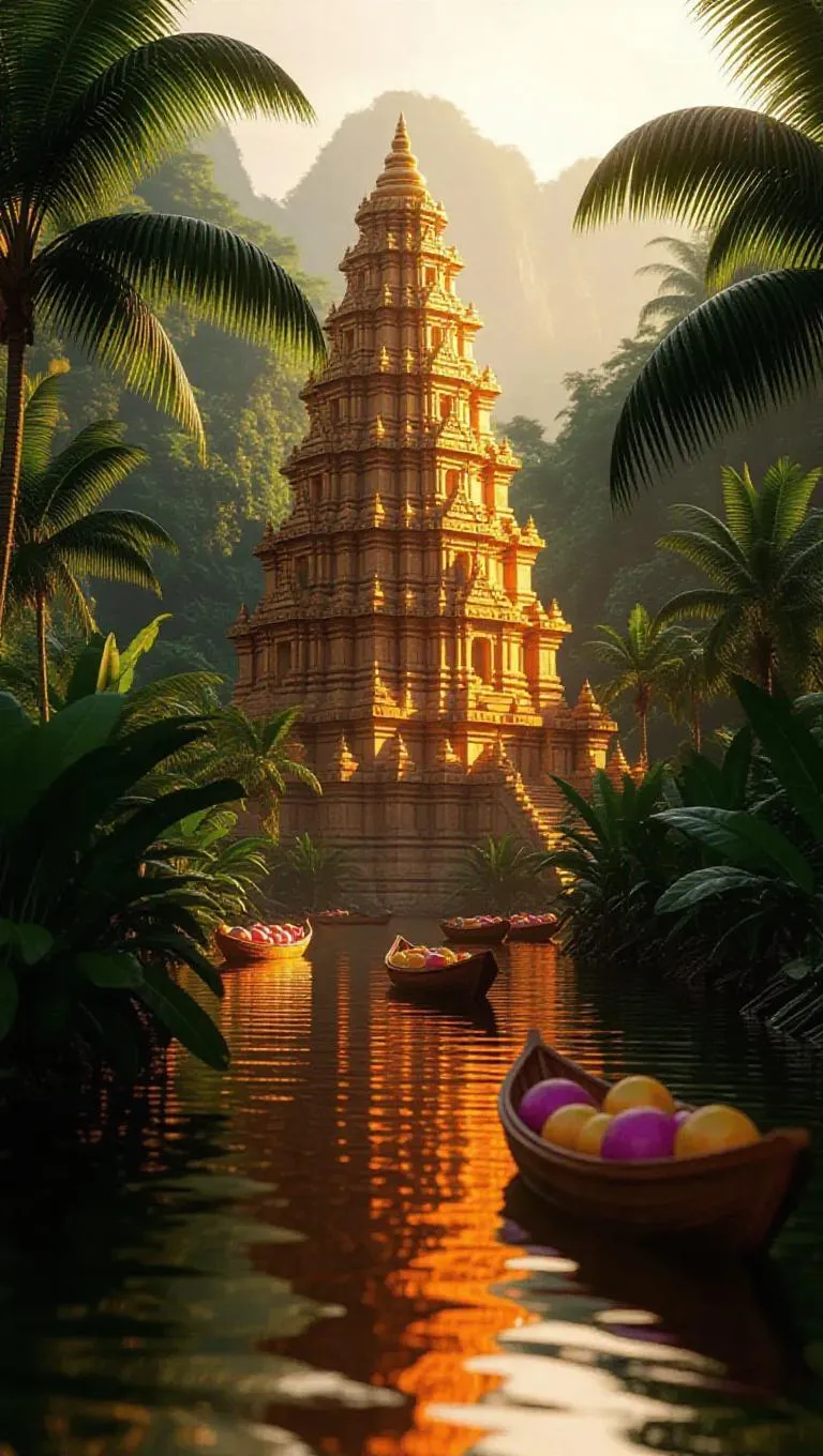 Step into an AI-generated tropical jungle where mango temples and glowing rivers meet dragonfruit canoes. Explore mystical landscapes blending nature with surreal architecture. Create vibrant, otherworldly scenes using Vivago.ai's creative tools – perfect for crafting immersive digital art and fantastical visual storytelling.
