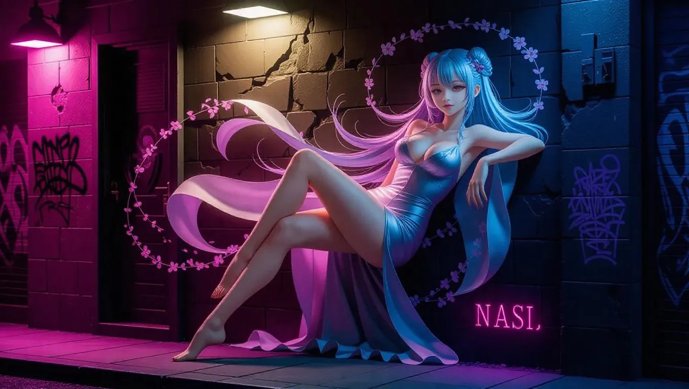 A breathtaking anime mural of a seductive yet elegant girl painted on the side of a dimly lit urban building. She has long, flowing silver hair with subtle violet highlights, and her body is wrapped in a translucent silk-like robe that flutters as if alive. Her expression is mysterious and alluring, with half-lidded glowing eyes and a slight smirk. She leans gracefully against the wall, one leg bent, as cherry blossom petals and neon ink swirls form a magical aura around her. The cracked concrete is filled with faded graffiti and glowing arcane symbols. Cinematic backlight in pink and blue tones adds dramatic contrast, enhancing the urban edge and ethereal beauty. Style: high-resolution anime mural, cinematic realism, soft glow, sensual but tasteful composition. Aspect ratio: 16:9.