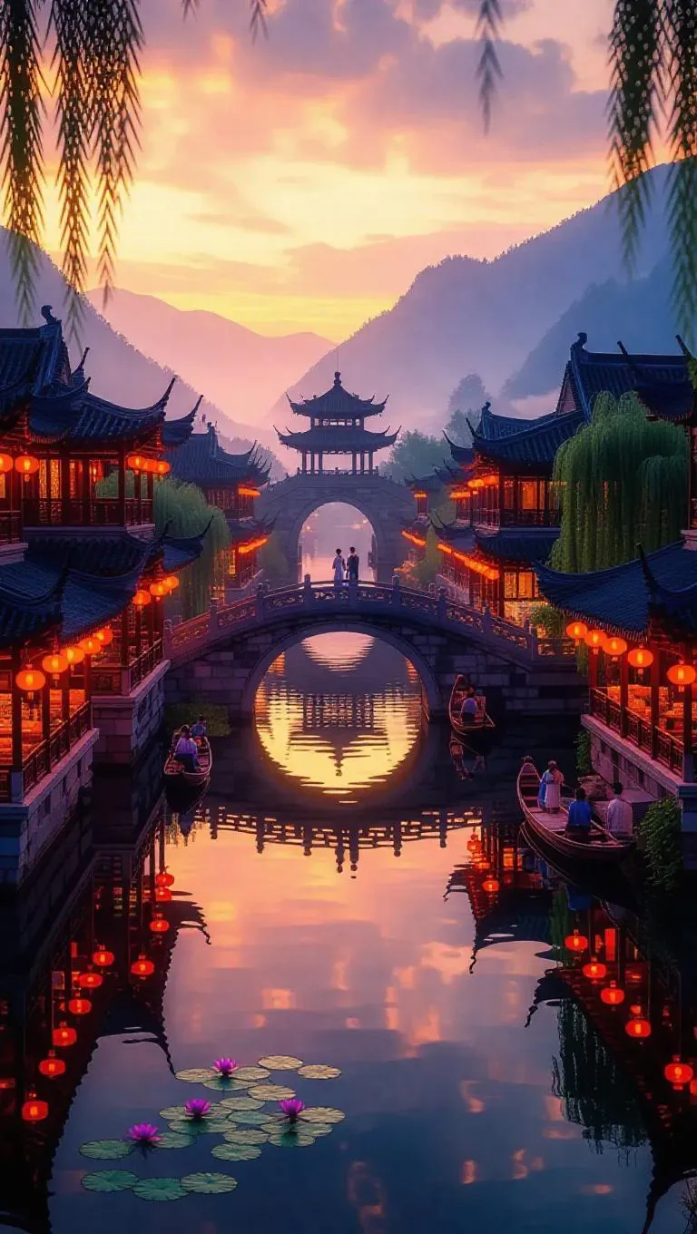 Experience AI-generated ancient Chinese splendor with bustling riverside markets, silk-robed nobles, and mist-draped willow rooftops. Anime-style shimmering canals, lotus-filled lakes, and lantern-lit pavilions blend traditional ink aesthetics with modern vibrancy. Vivago.ai crafts dreamscapes where poets, dancers, and golden osmanthus blooms thrive under sunset clouds—redefining tradition through New Chinese Style artistry.