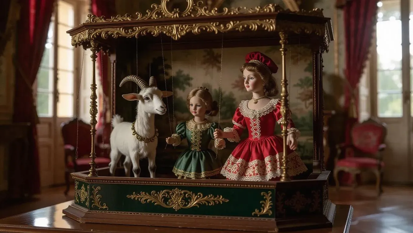 Generate a whimsical AI marionette scene with a boy and girl goat inside a French mansion. Craft puppet show magic using text prompts or reference images. Explore Vivago.ai's AI effects for enchanting visuals and professional storytelling in puppet theater settings.