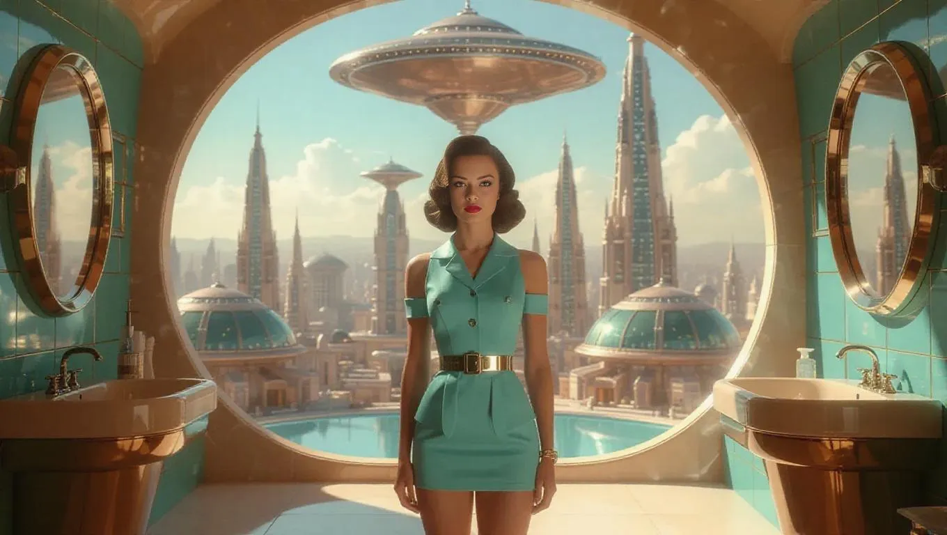 Transform text into retrofuturistic visuals with vivago.ai's AI image generator. Create 1950s glamour girls in Gil Evgren and George Petty styles, set in photorealistic 35mm film scenes. Explore retrofuturistic cities with spires, glass domes, and saucer buildings. Design idealized sci-fi bathrooms featuring sleek appliances, turquoise-beige palettes. Perfect for vintage-inspired AI art evoking classic pulp magazine covers.