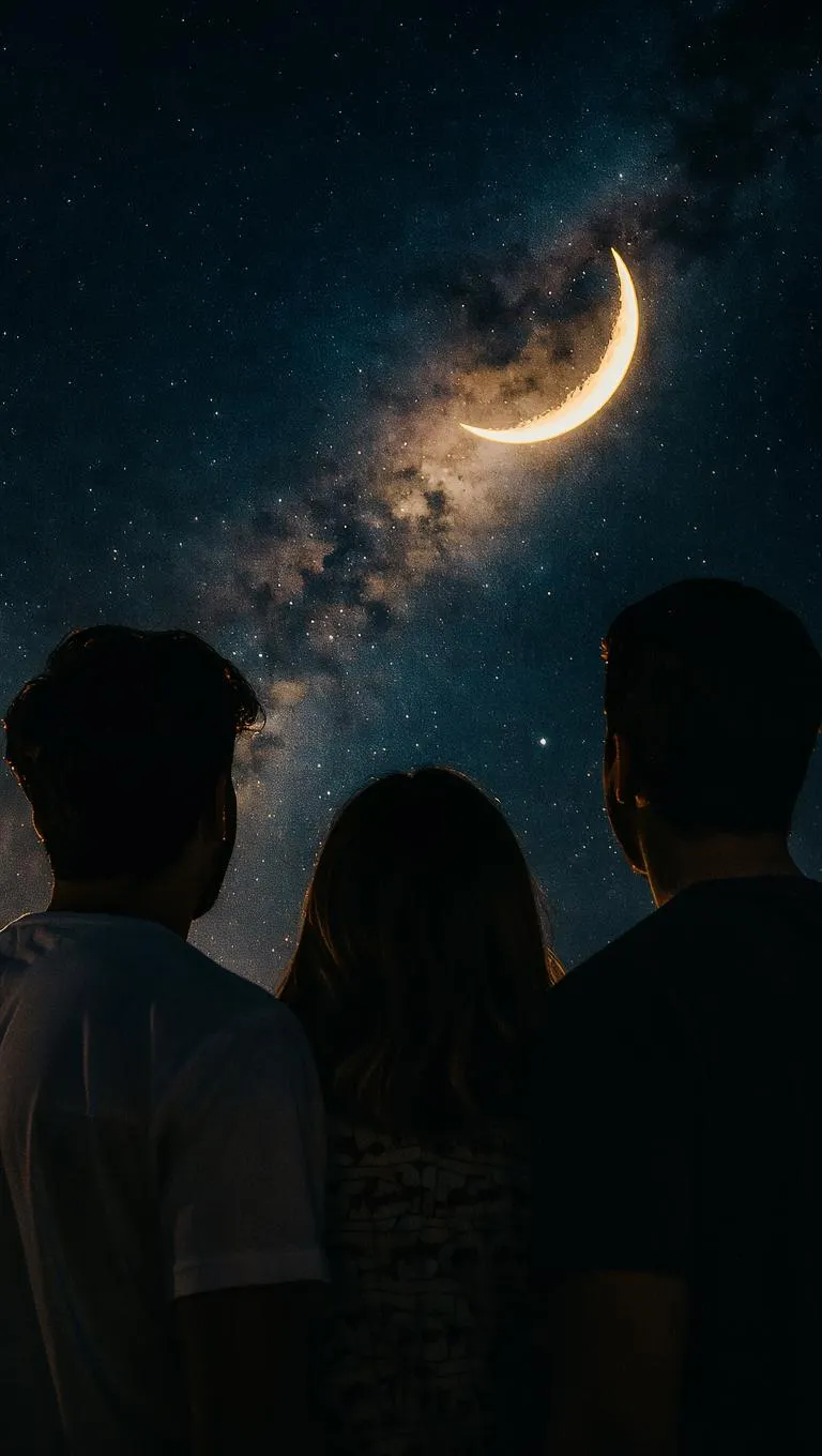 Generate captivating AI night sky scenes with our advanced image generator. Create over-the-shoulder views featuring people gazing at ethereal cosmic lights under stars and a crescent moon. Experience wonder, mystery, and serene atmospheres with VivaGO.ai's AI visual creation tools. Perfect your dreamlike celestial visuals effortlessly.
