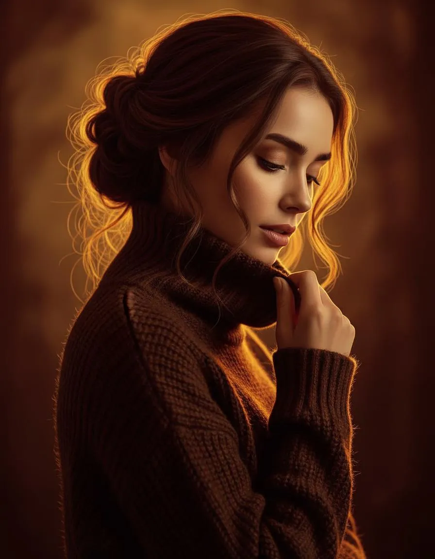 Portrait in cinematic light-and-shadow style. Upper body of the reference woman, wearing a dark knitted turtleneck sweater, head tilted slightly with eyes closed, one hand lifting the collar. Loose updo hairstyle with soft strands falling around her face. Warm golden backlight creates a glowing halo on her hair, with dramatic contrast and soft shadows on her face. The entire image is infused with rich red, yellow, and brown tones, enhancing a nostalgic and moody atmosphere. Blurred background in warm earthy hues, cinematic and artistic.