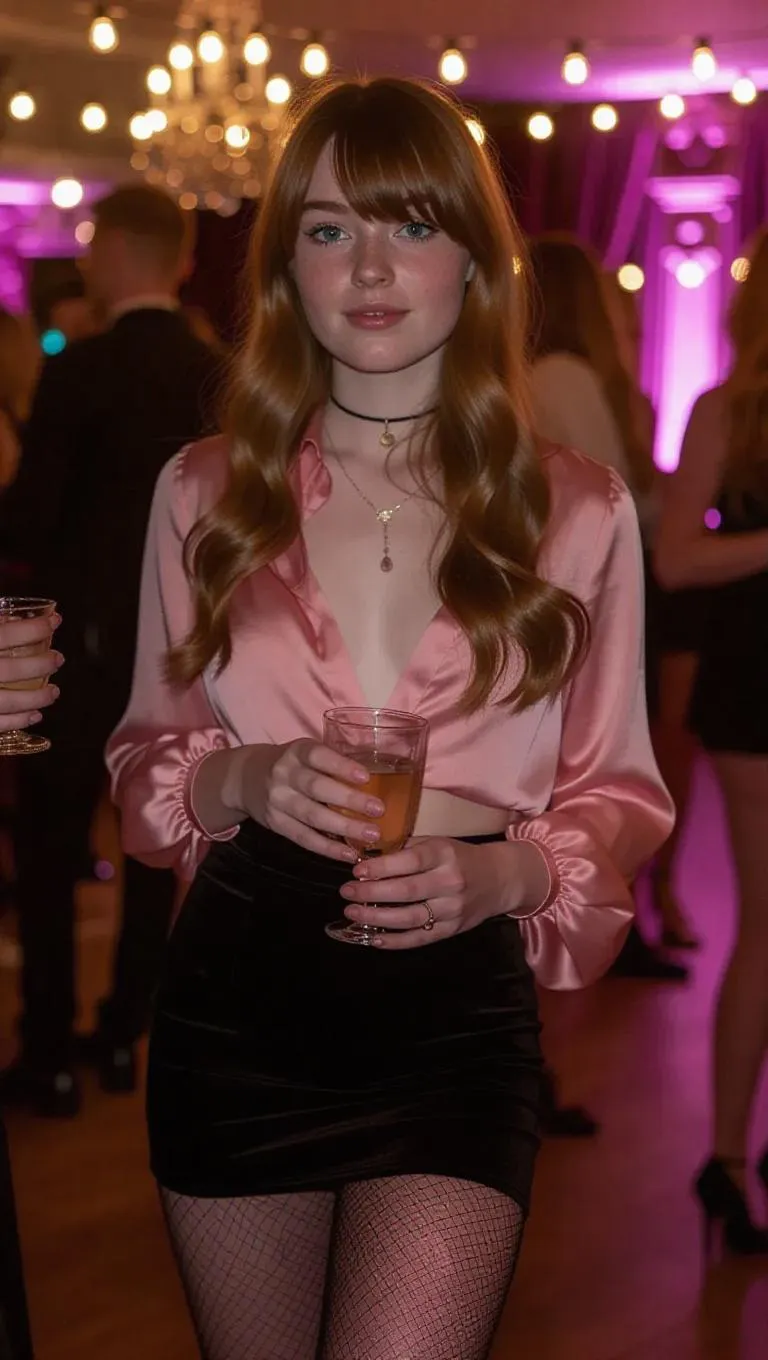 Create lifelike AI-generated images of a stylish British teen girl at a party scene. Features long ginger hair with highlights, black micro skirt, nylons, heels & pink silk blouse with open neck. Drink in hand. Generate stunning party scenes with Vivago.ai's AI art generator.