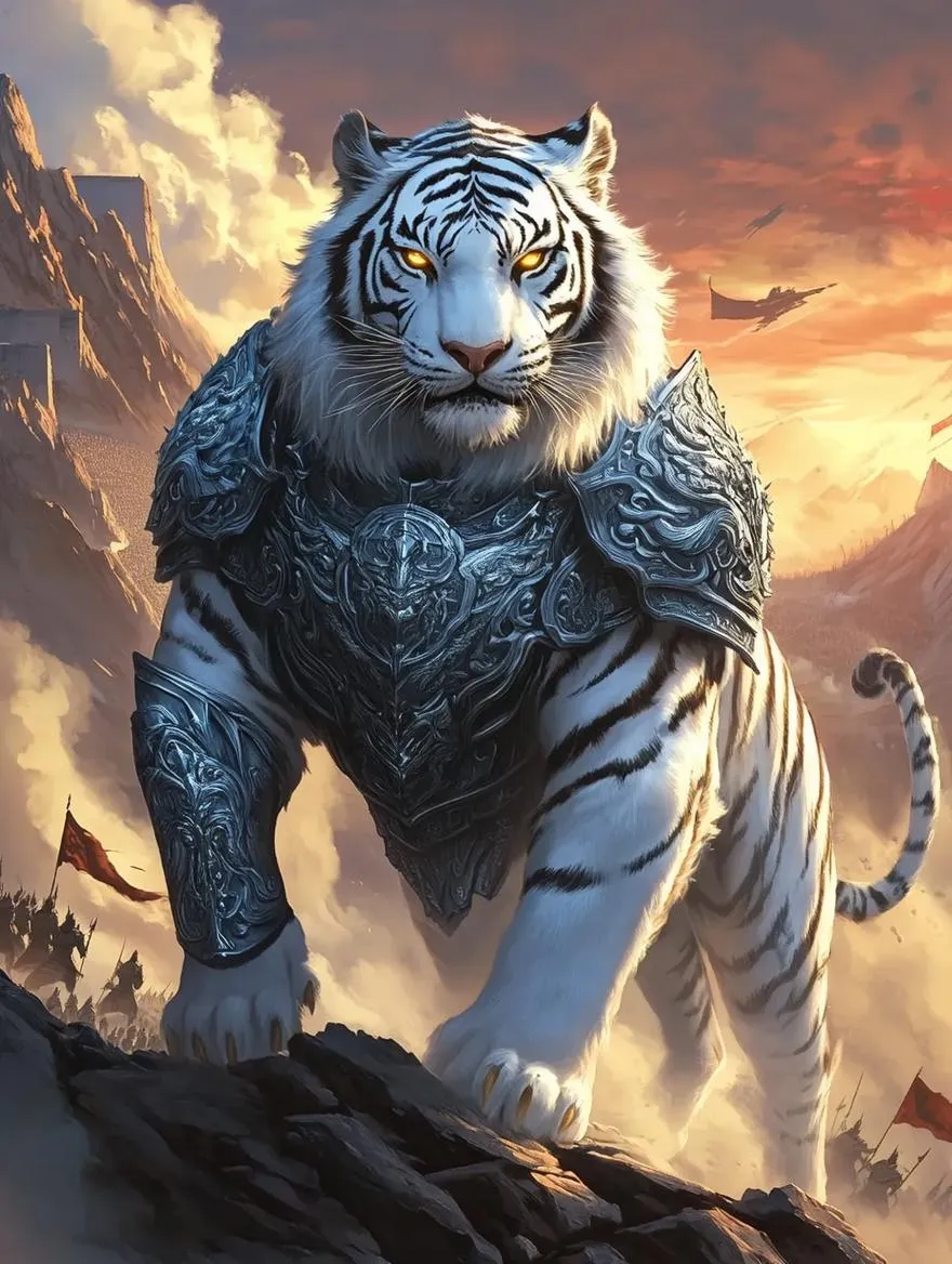 Majestic armored white tiger commands Chinese-style epic battles at sunset. AI-generated fantasy art blends intricate silver-blue armor, thundercloud motifs, and rugged mountain fortress backdrops with massive armies. Vivago.ai crafts heroic Eastern war aesthetics through anime-inspired metallic effects, motion lines, and solemn moods for striking AI imagery.