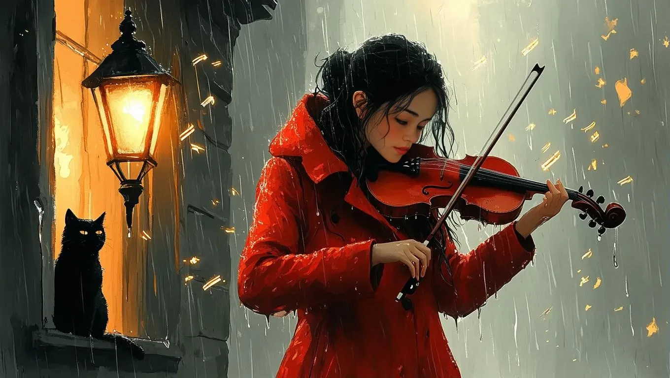 Immerse in a cinematic anime watercolor scene where a violinist in a red coat conjures glowing ink ribbons under a flickering streetlamp. Rain-soaked melancholy meets chiaroscuro lightplay, with a watchful black cat and expressive brushwork fading into ethereal shadows. AI-powered artistry brings spellbinding emotion to life.