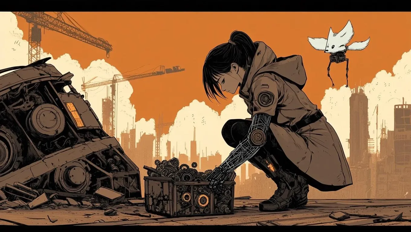 Create cinematic anime art with AI: post-apocalyptic mechanic girl salvaging android parts amid rusted ruins. Watercolor textures blend with high-contrast sepia tones, golden rustlight, and dynamic wind effects. Perfect for desolate yet heroic AI-generated scenes. Elevate your storytelling through Vivago.ai's curated anime-style visuals and atmospheric worldbuilding tools.