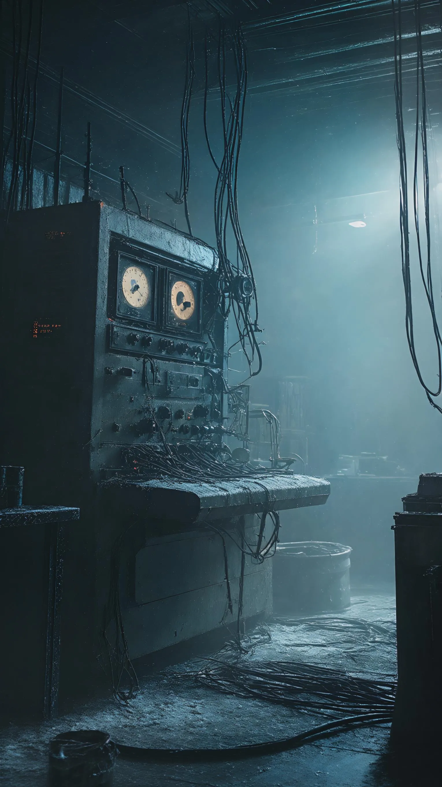 Generate eerie AI images of an abandoned lab with a dormant yet alive machine pulsing internally. Capture cinematic horror realism: deep shadows, oppressive silence, high contrast lighting, soft film grain. Create this dark, atmospheric scene using Vivago.ai's powerful text-to-image generator for professional visuals. Perfect for horror & sci-fi concepts.