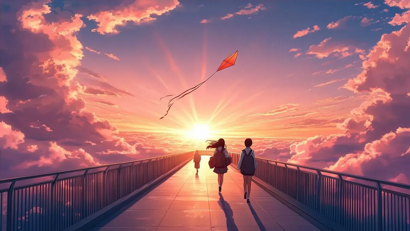 Transform text into stunning AI-generated anime scenes with Vivago.ai. Create serene, cinematic visuals of a floating bridge over pink-orange sunrise clouds, students walking, and a lone kite. Wide-angle watercolor effects amplify the hopeful, dreamy atmosphere. Perfect AI art for ethereal, cinematic storytelling.
