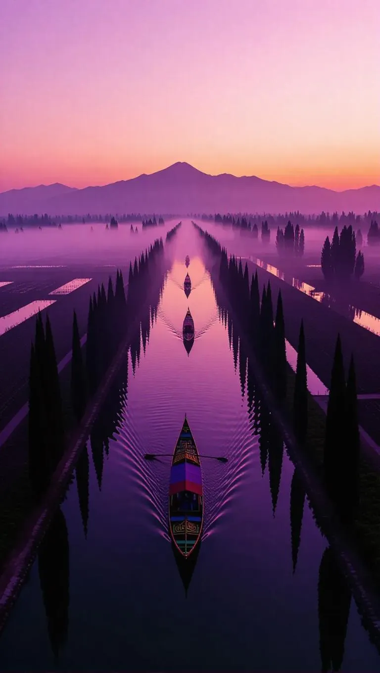 Capture the haunting beauty of Xochimilco's mist-shrouded canals at dawn with this aerial drone shot. Ethereal golden-pink light bathes UNESCO World Heritage chinampas, colorful trajineras, and ghostly cypress sentinels. Volumetric lighting accents ancient waterways beneath lavender-gray skies, muted saturation enhancing the tranquil yet eerie atmosphere of Mexico's iconic floating gardens.