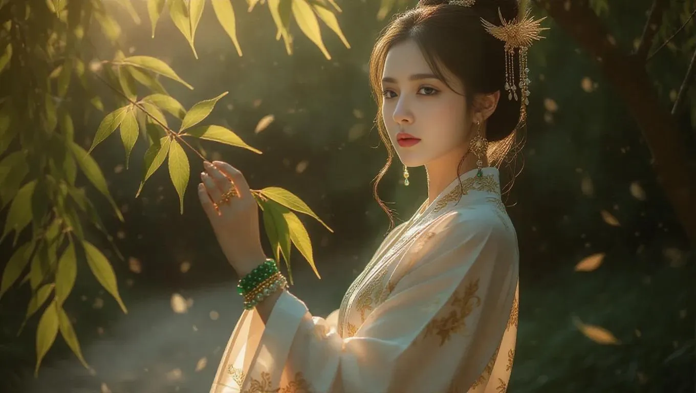 Discover AI-generated Chinese-style art blending ancient elegance with anime soft light. This scene features a mysterious woman in silk robes, jade bangles, and a golden phoenix hairpin gathering mulberry leaves under willow branches. AI effects enhance flowing fabrics, falling leaves, and subtle sparkles, evoking poetic beauty and quiet loneliness. Perfect for creating ethereal, culturally rich visuals with professional AI tools.