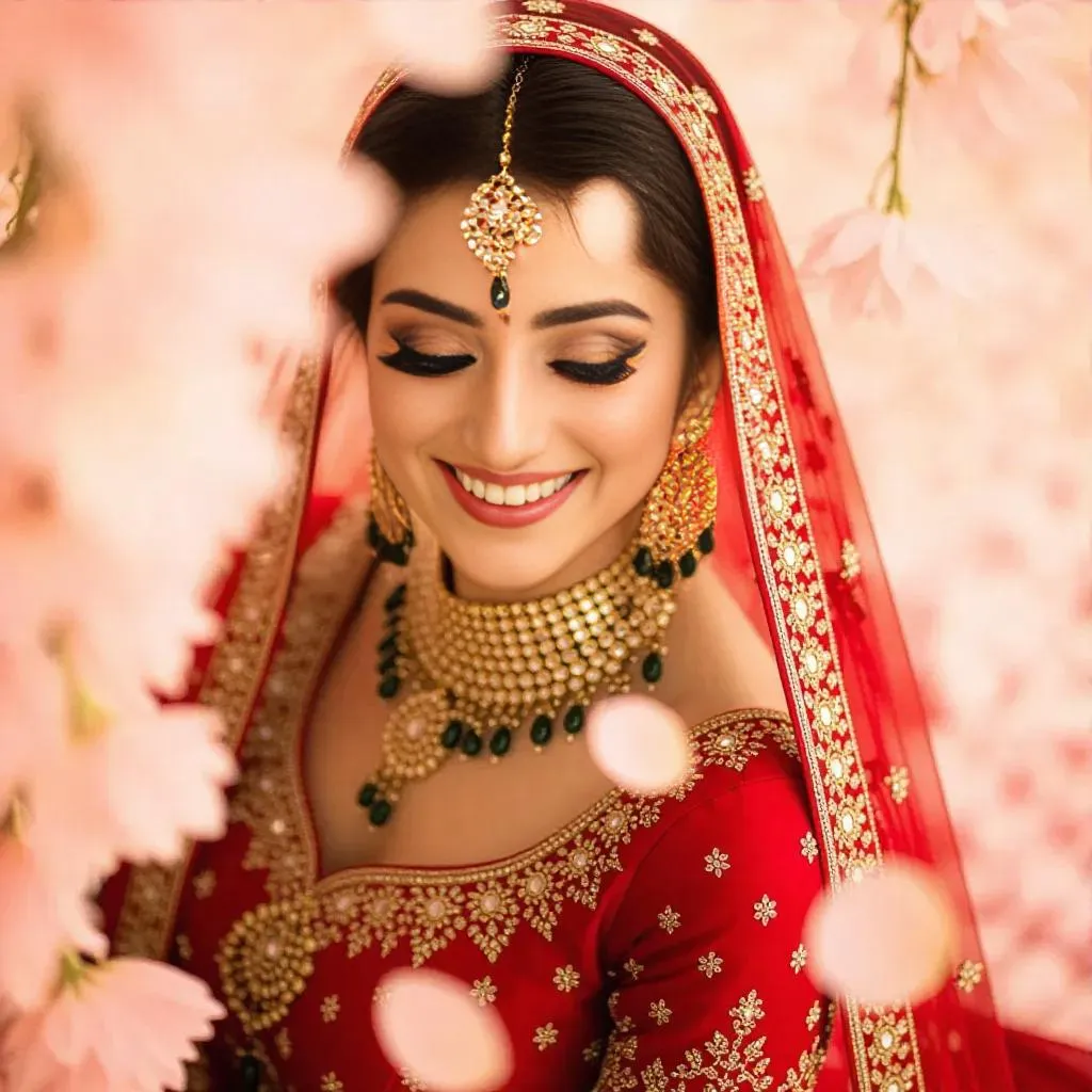 Create a stunning Muslim bridal look with vivago.ai's AI tools. Generate radiant bridal visuals in a vibrant red lehenga, intricate embroidery, and full traditional makeup. Perfect for wedding content, our AI crafts professional-grade, culturally rich designs with flawless details for your special moments.