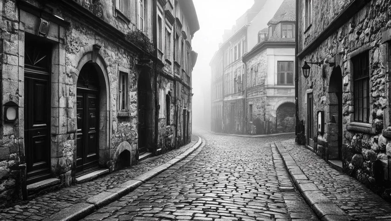 Step into timeless Europe with this AI-generated black and white photo of a vintage cobblestone street. Weathered stone buildings, distant fog, and intricate architectural details evoke classic charm. Explore AI image tools for stunning grayscale photography with timeless elegance.