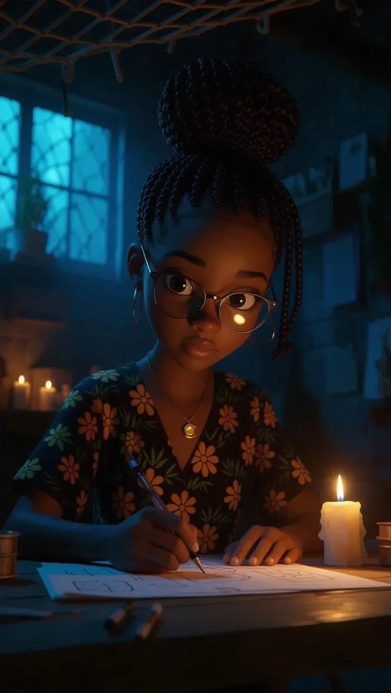 Generate realistic AI images of a 15-year-old African girl with box braids, showcasing cultural details like Ankara fabrics and dashiki. AI-powered scenes feature medical sketching at night or laundry moments near clay homes, capturing emotional depth, reflective glasses, and authentic textures. Transform prompts into vivid visuals with Vivago.ai's advanced image generation tools.