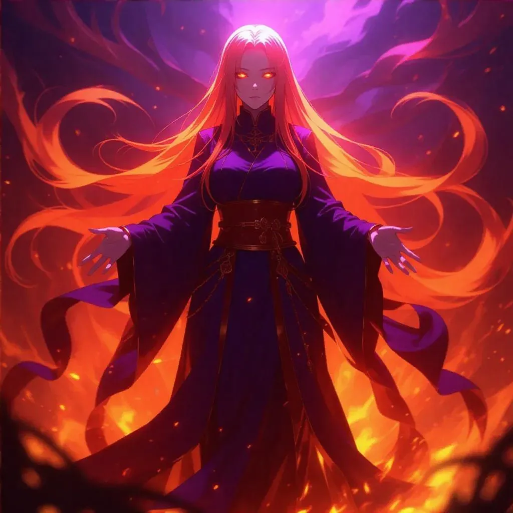 Generate a striking female manga ghost character with AI using vibrant orange, purple, and red hues. Transform text prompts into dynamic visuals with Vivago.ai's curated effects for professional-grade artistry, blending spectral themes and bold colors seamlessly. Perfect for manga fans and creators seeking eye-catching, AI-powered anime-style designs.